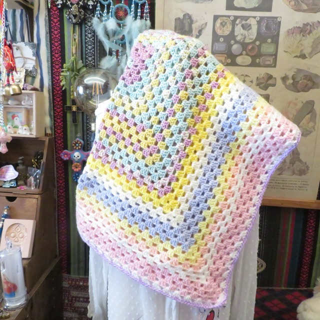 手編みのブランケットです、かぎ針編みでグラニースクエアという四角に大きくしていく編み方をしています。昔からある伝統的な形です。私なりの感覚でカラフルで可愛くしてみました! 1人分のひざ掛けにちょうどよく、ひざ掛けのほかにもマルチカバーとしてお使いになってもいいかもしれません。 サイズ60㎝くらい アクリル糸使用 ※こちらは暈があるので宅急便のみの発送で、ほかの商品との購入もまとめて梱包できます。
