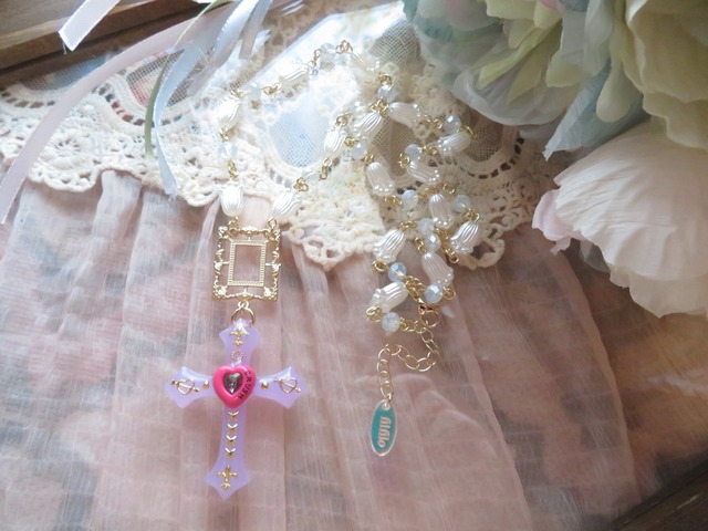 ※ハートの羽根部分に少し変色がでてしまったのでお値下げしました。2025/08/17 ※今回紫色のバリエーションがとてもあります、画面環境や明るさで実物との色に差があるかもしれません。お写真だと3枚目のトルソーの画像くらいの暗さが実物に近いお色になります。 オリジナルの装飾十字架です。メキシコのミラグロをインスパイアしたデザインが特徴的なアクセサリーです。さまざまなパーツが繊細にデザインされクレイとレジンを使用し秘密のパールを仕込むことで陶器のような独自の風合いを持っています。 メキシコのミラグロは、願いを叶えるためのお守りとして用いられます。本来の用途は壁飾りですが身につけることで幸せや願いのお守り的な役割になったらいいなと思っています。 クレイやレジンの素材感を活かした、個性的なデザインなので、おしゃれなコーディネートのアクセントとしても活躍します。まるで芸術作品のようなネックレスを身につけることで、普段のスタイリングのスパイスにしてください♪ ※商品の特性上、直射日光や高温多湿の場所での保管はお避けください。 長さ60㎝+アジャスター5㎝ 金属アレルギーには対応しておりません。国内外のパーツを使用しています。 オリジナルエンドパーツ使用、トップ裏側にブランド名あり。