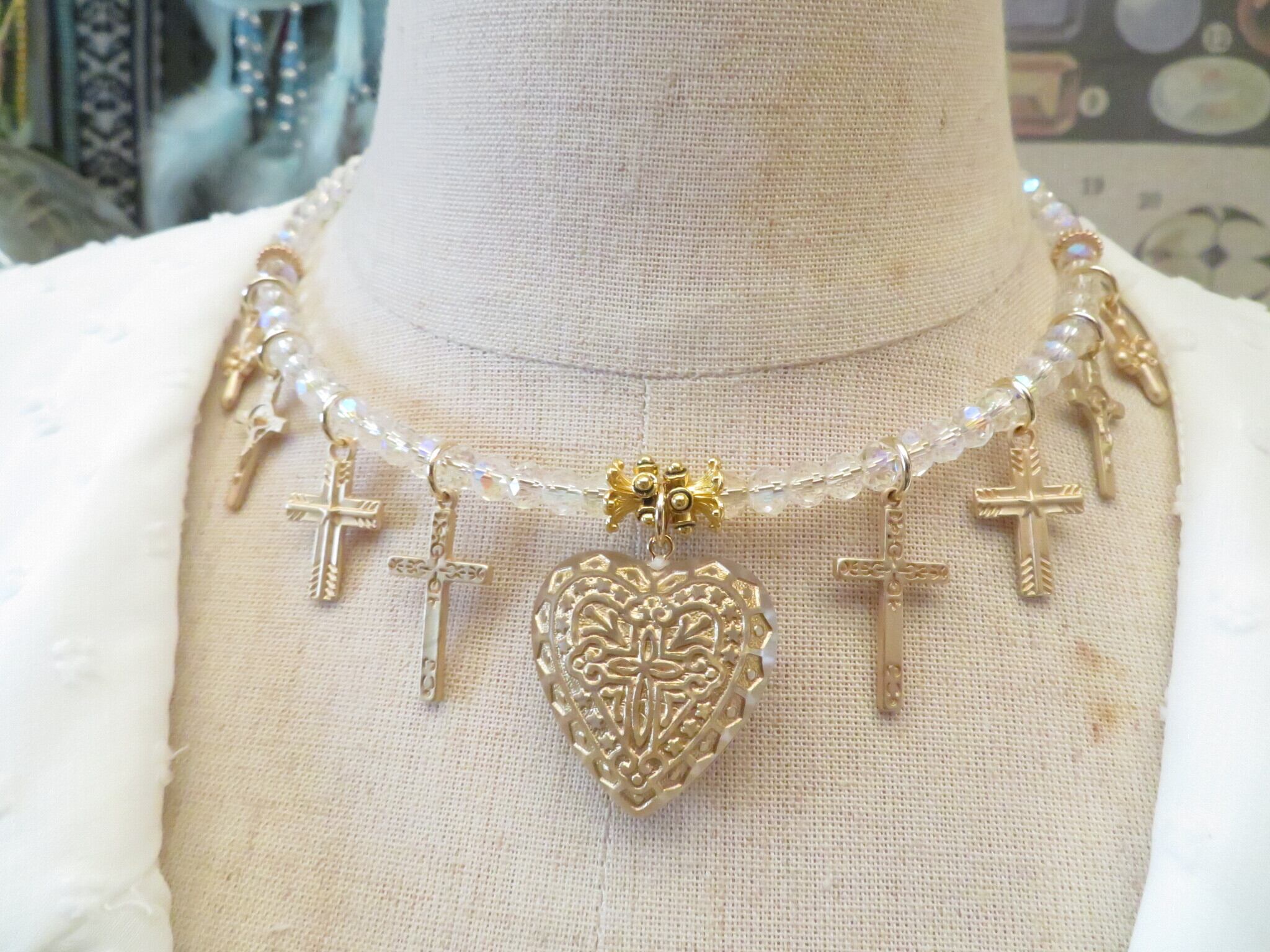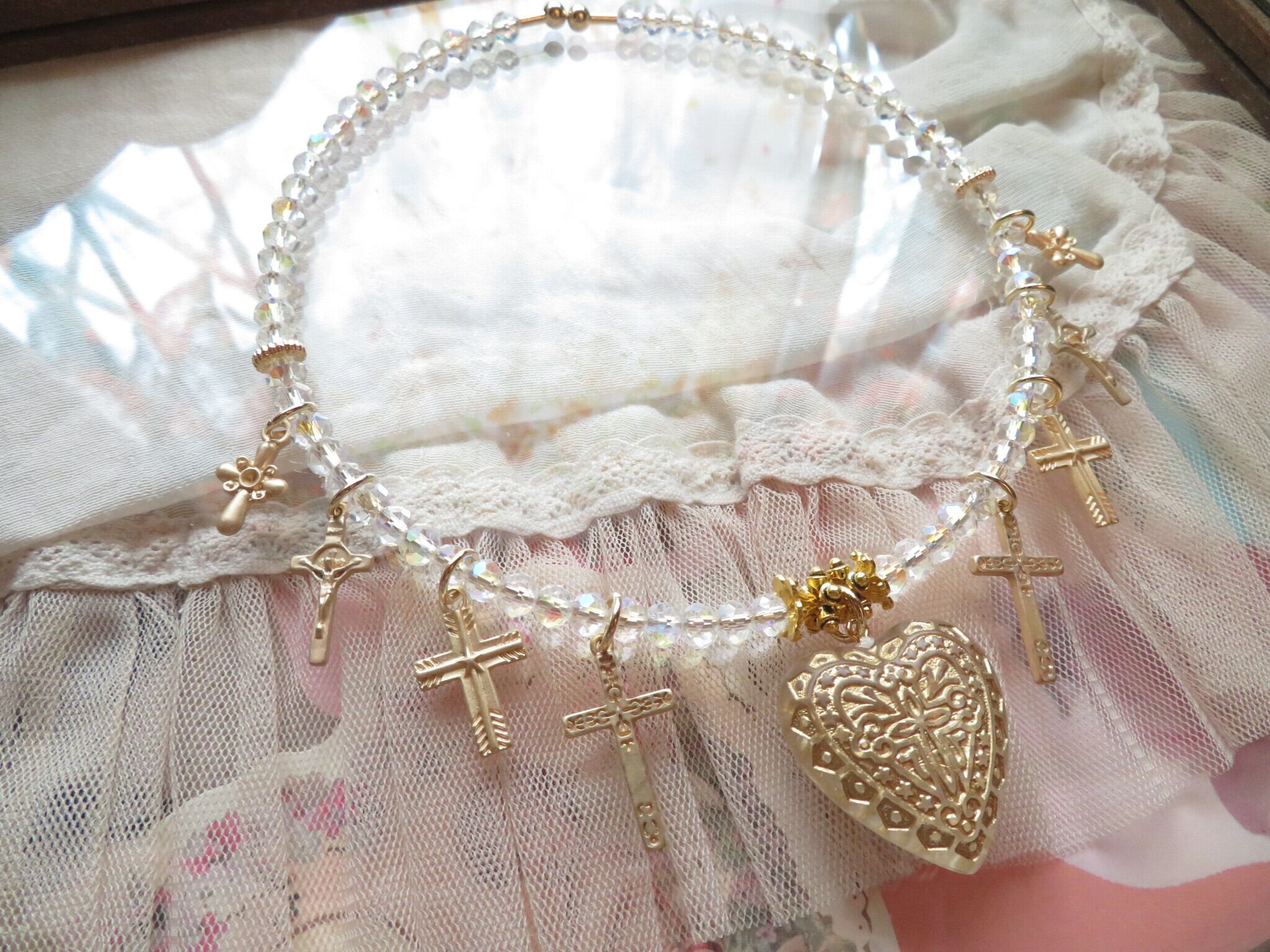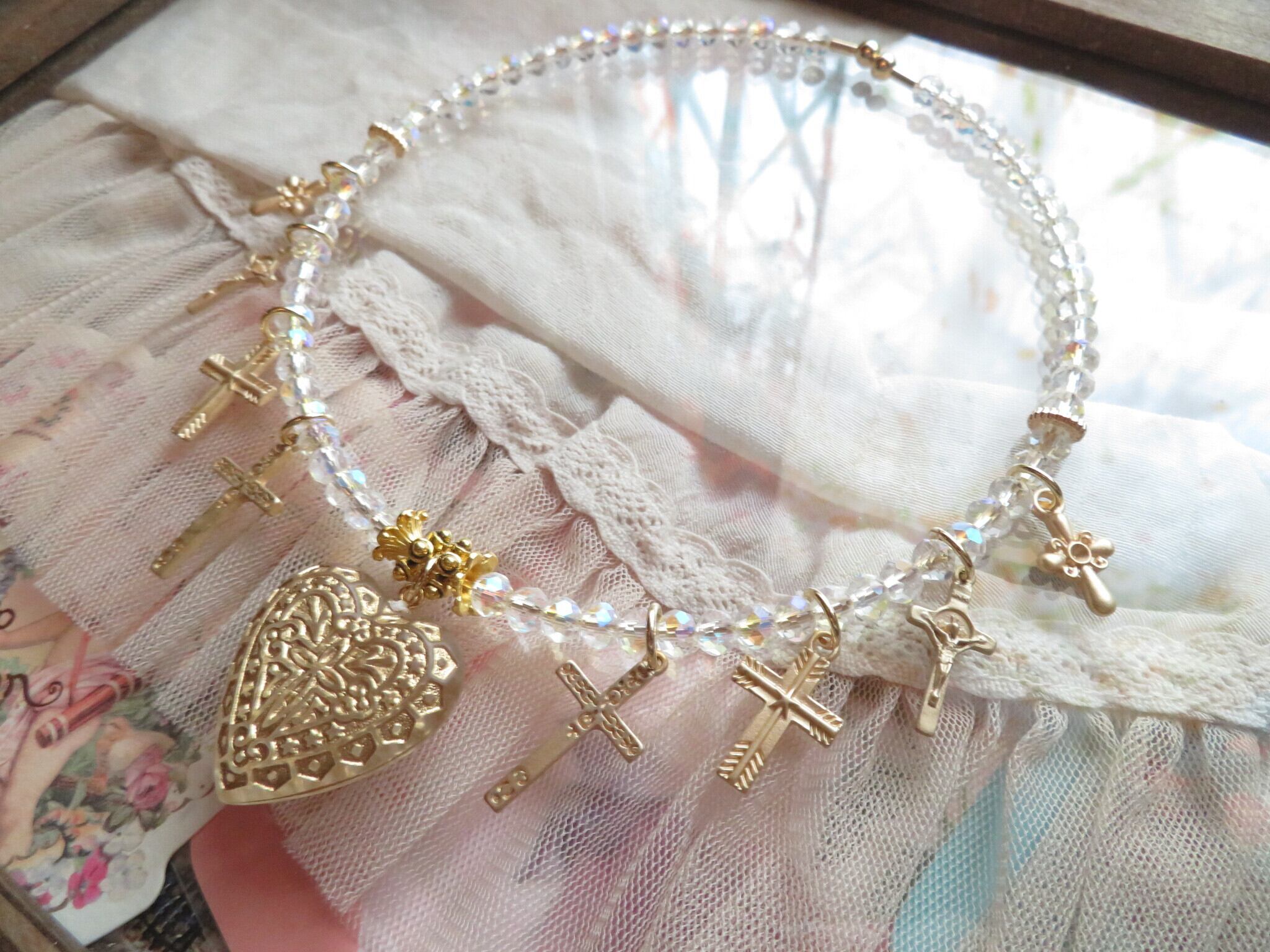 久しぶりのワイヤーチョーカーシリーズです。今回はさわやかなキラキラとしてベースのガラスビーズはすべて同じものを使用しています。クリアなのですがカットに青の偏光がほどこされておりいっそう爽やかさが増します。