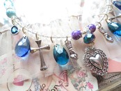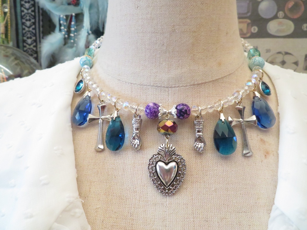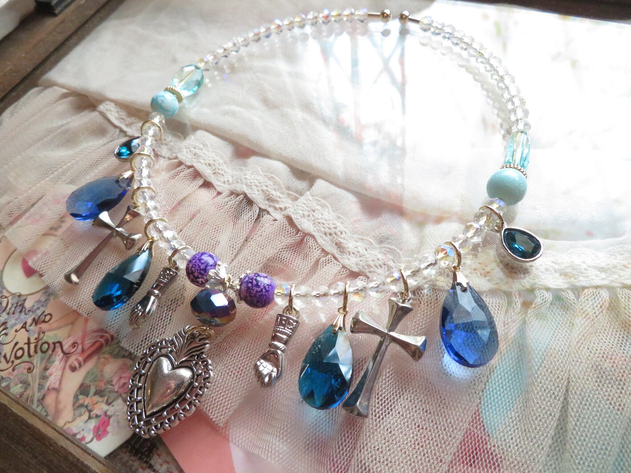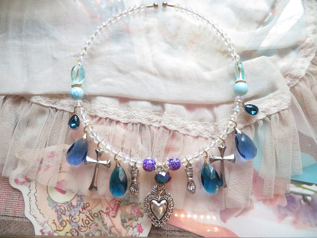 久しぶりのワイヤーチョーカーシリーズです。今回はさわやかなキラキラとしてベースのガラスビーズはすべて同じものを使用しています。クリアなのですがカットに青の偏光がほどこされておりいっそう爽やかさが増します。