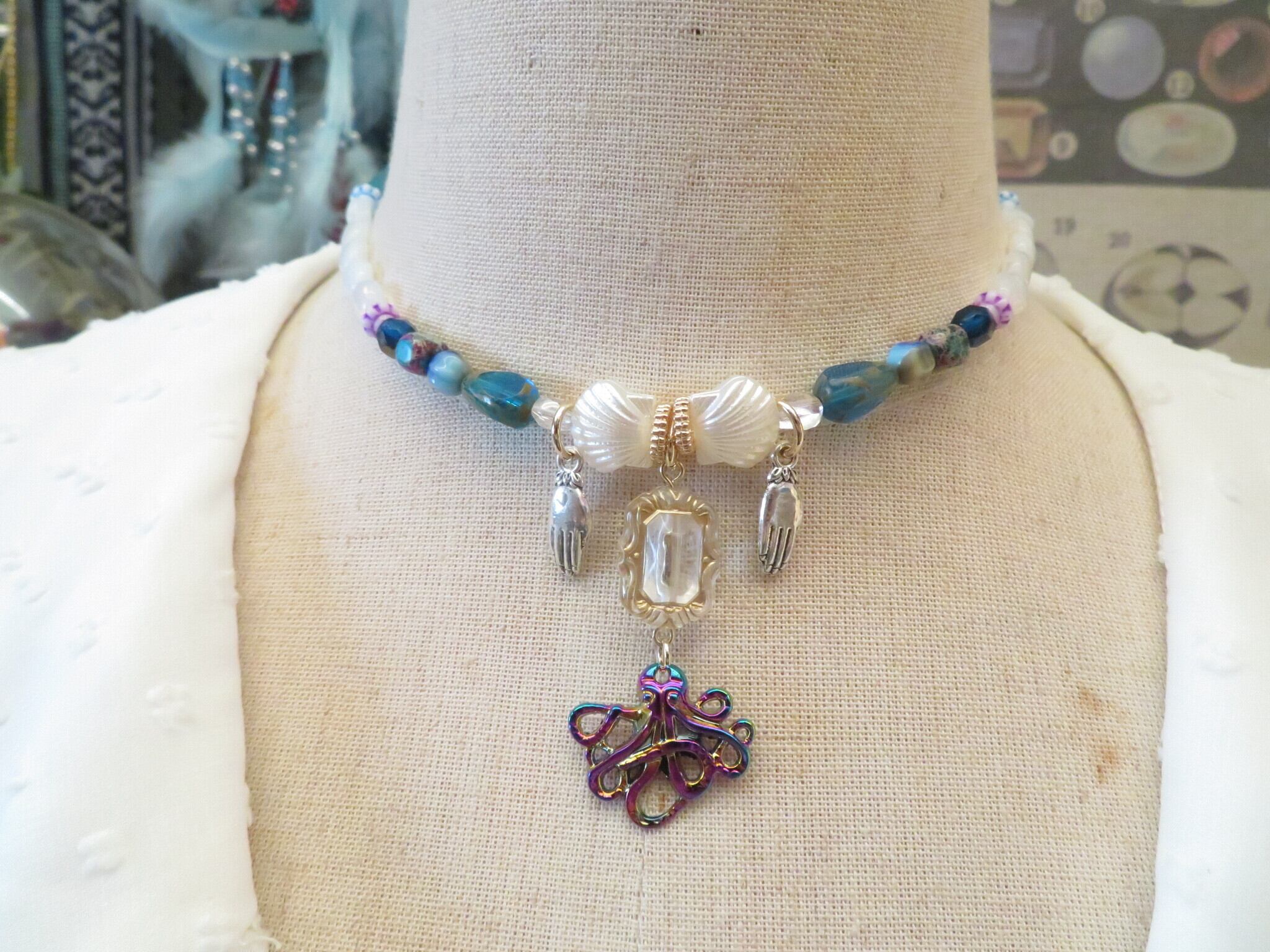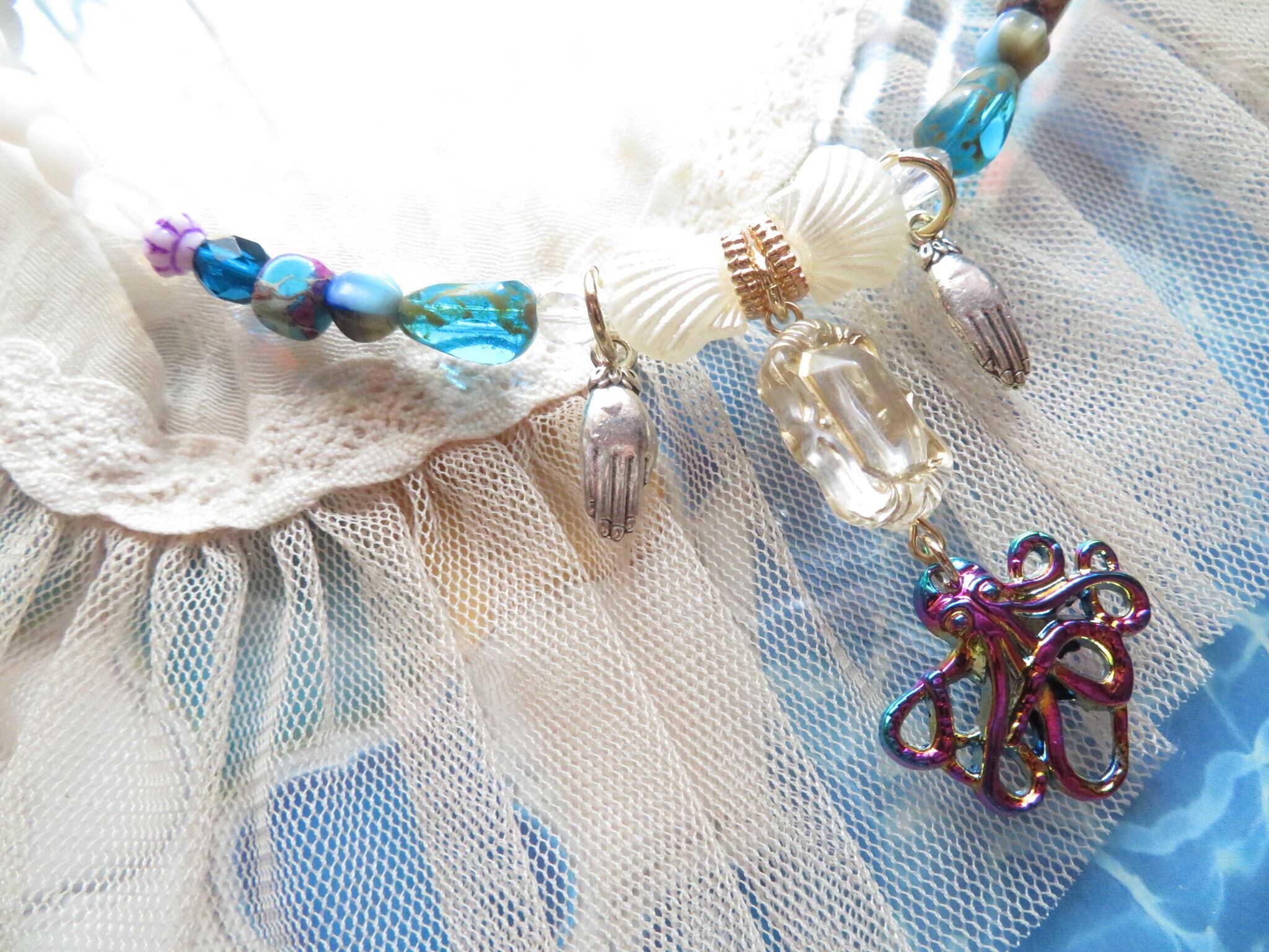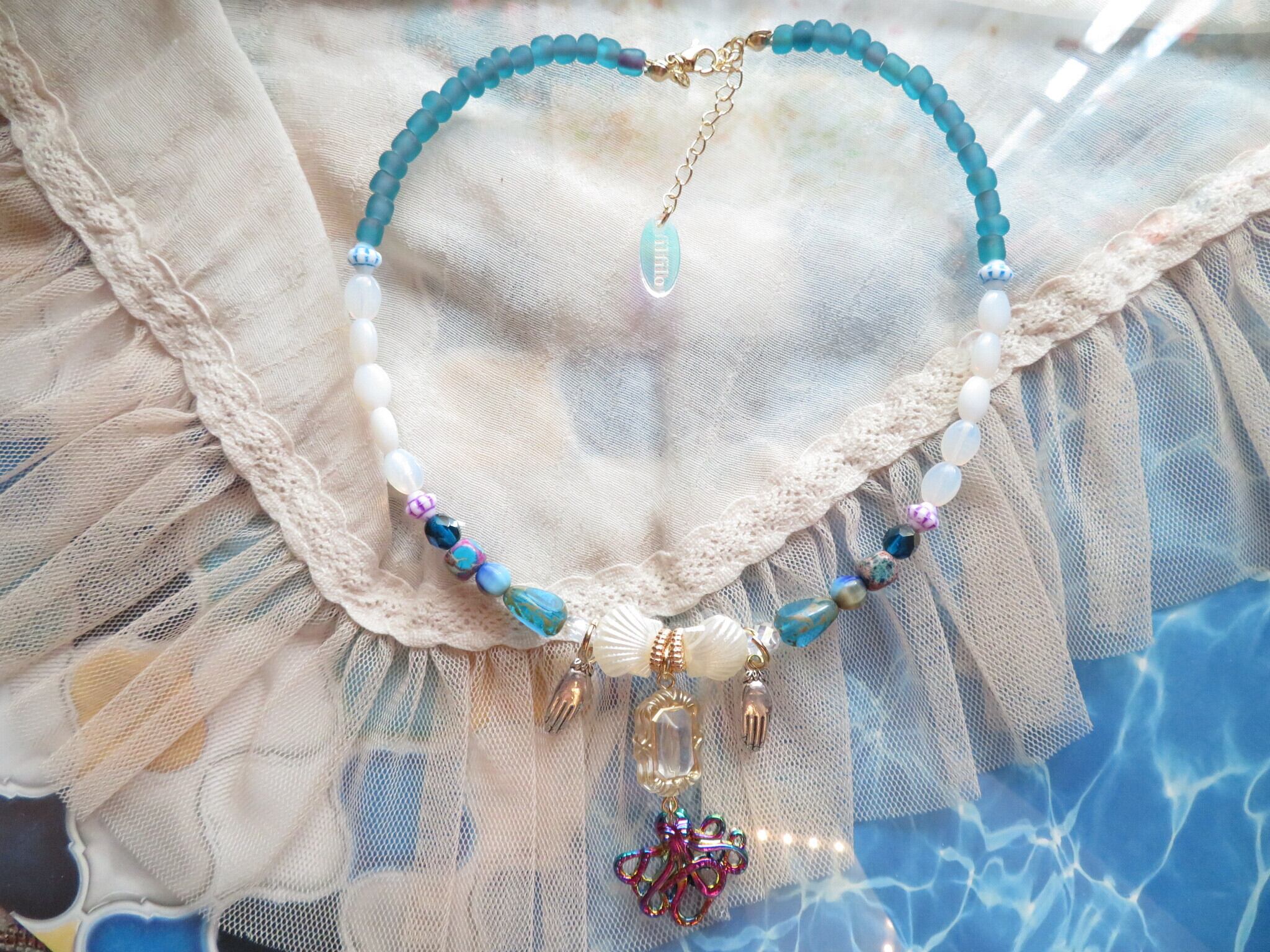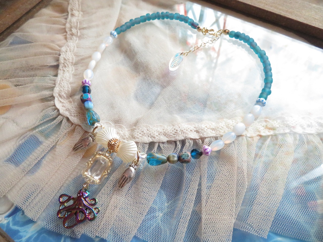 久しぶりのビーズネックレスシリーズです。今回は海をイメージして生き物や青いオリエンタルなトップなどたくさんのビーズを使って海の底の宝箱を想像しています。