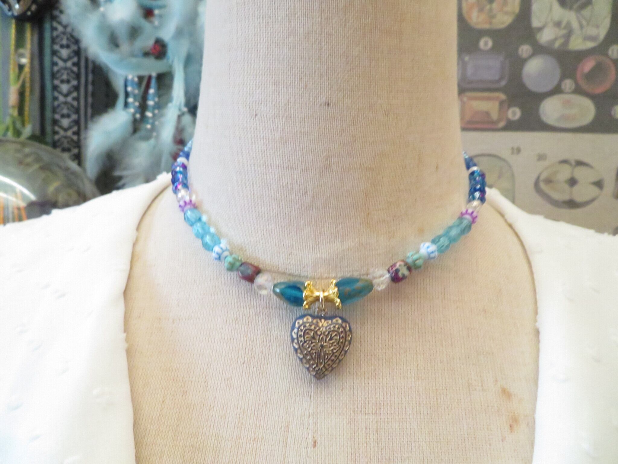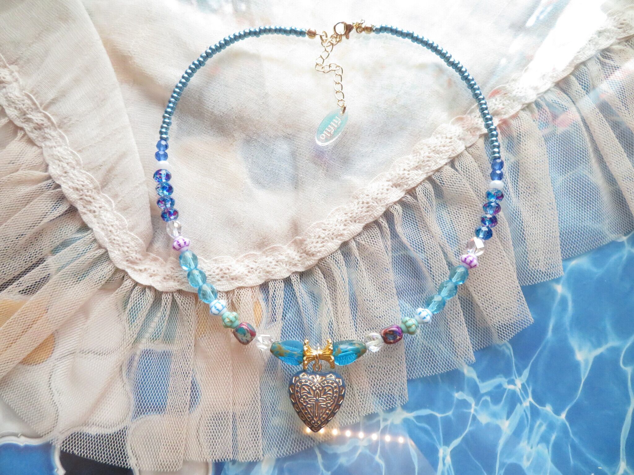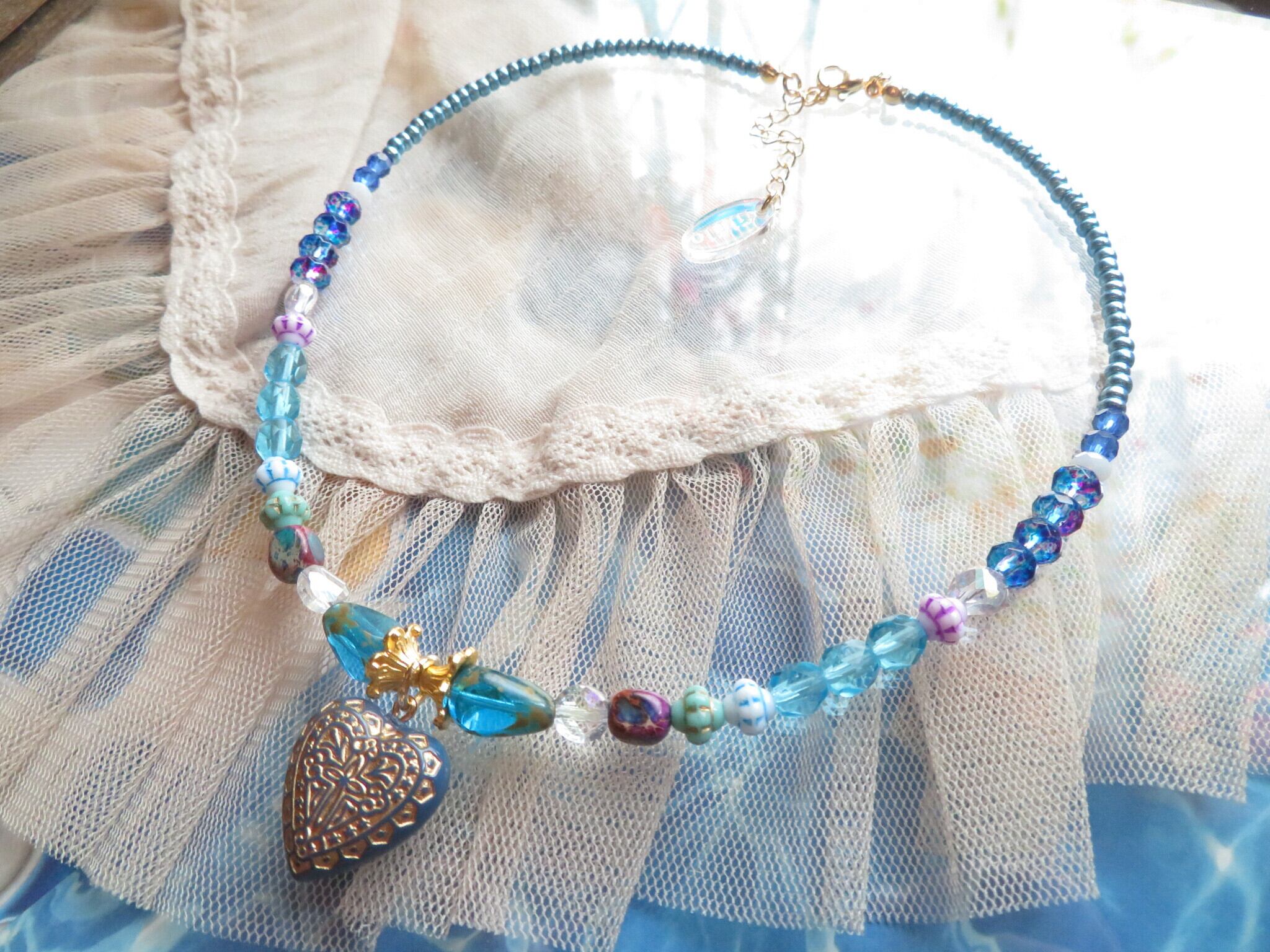 久しぶりのビーズネックレスシリーズです。今回は海をイメージして生き物や青いオリエンタルなトップなどたくさんのビーズを使って海の底の宝箱を想像しています。