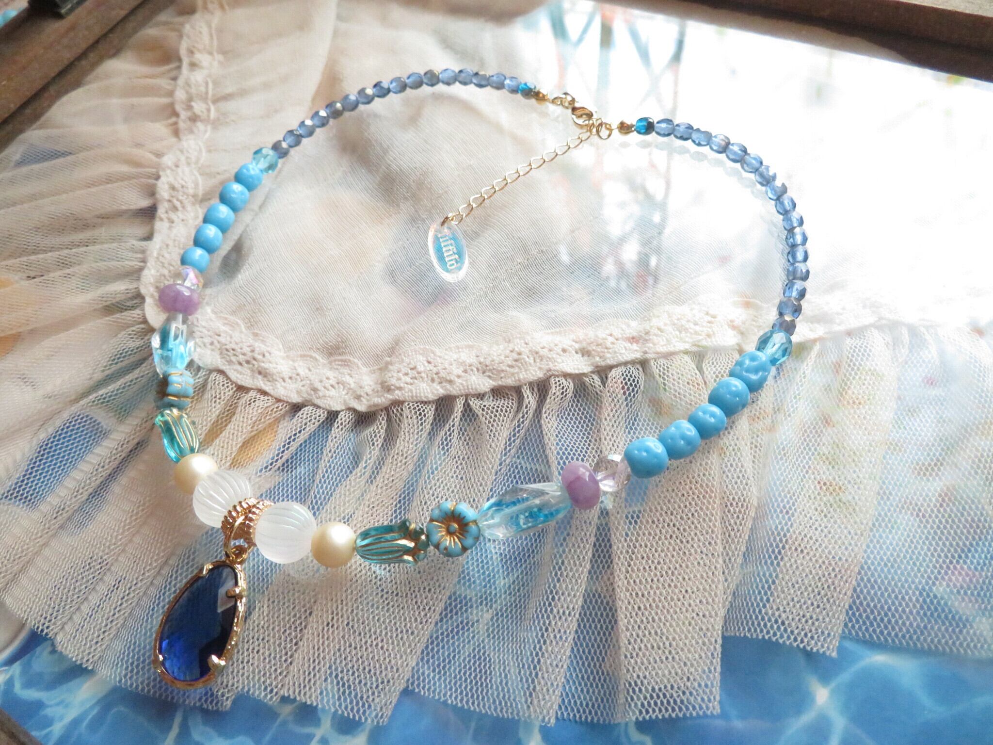 久しぶりのビーズネックレスシリーズです。今回は海をイメージして生き物や青いオリエンタルなトップなどたくさんのビーズを使って海の底の宝箱を想像しています。
