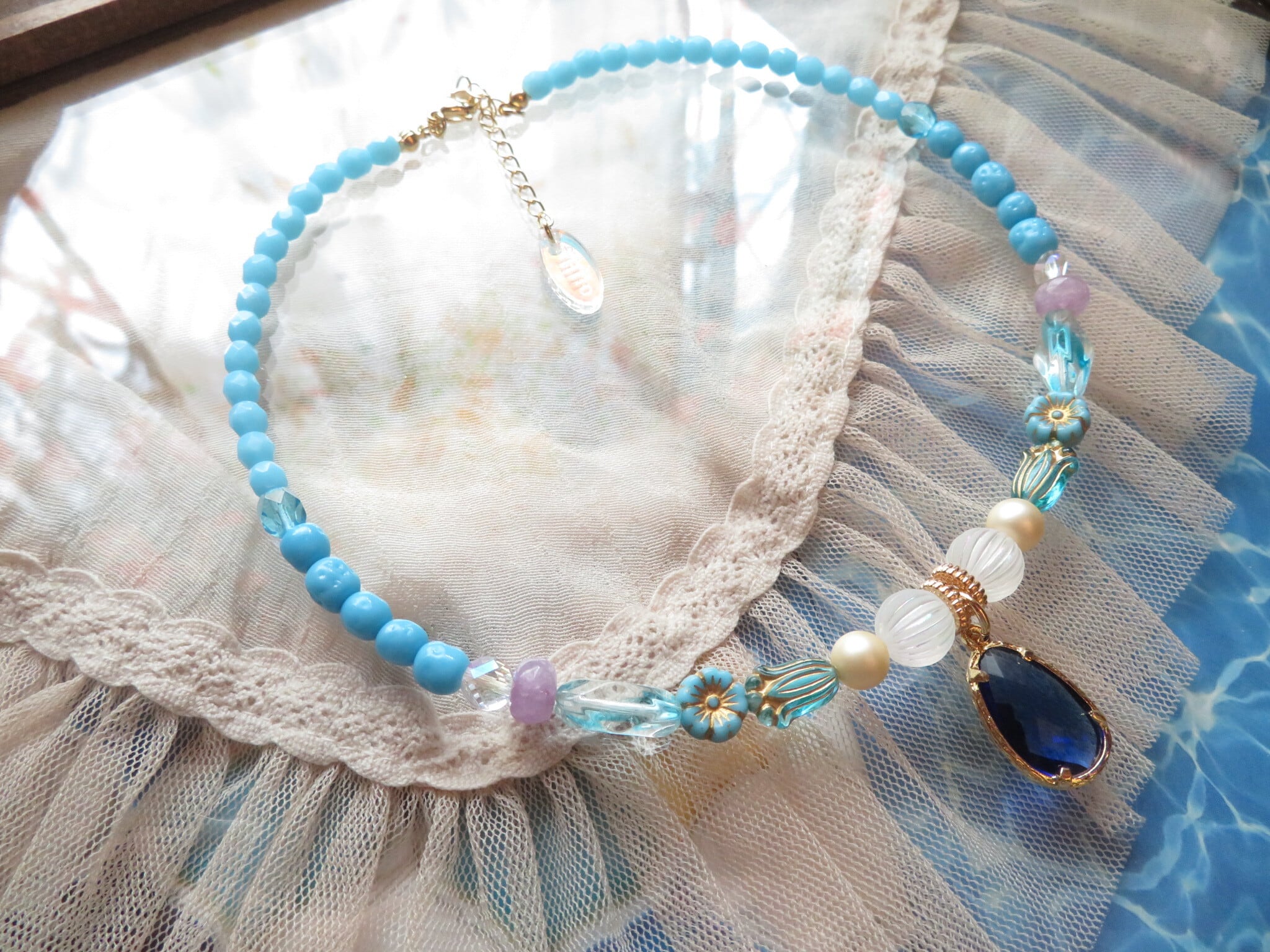 久しぶりのビーズネックレスシリーズです。今回は海をイメージして生き物や青いオリエンタルなトップなどたくさんのビーズを使って海の底の宝箱を想像しています。