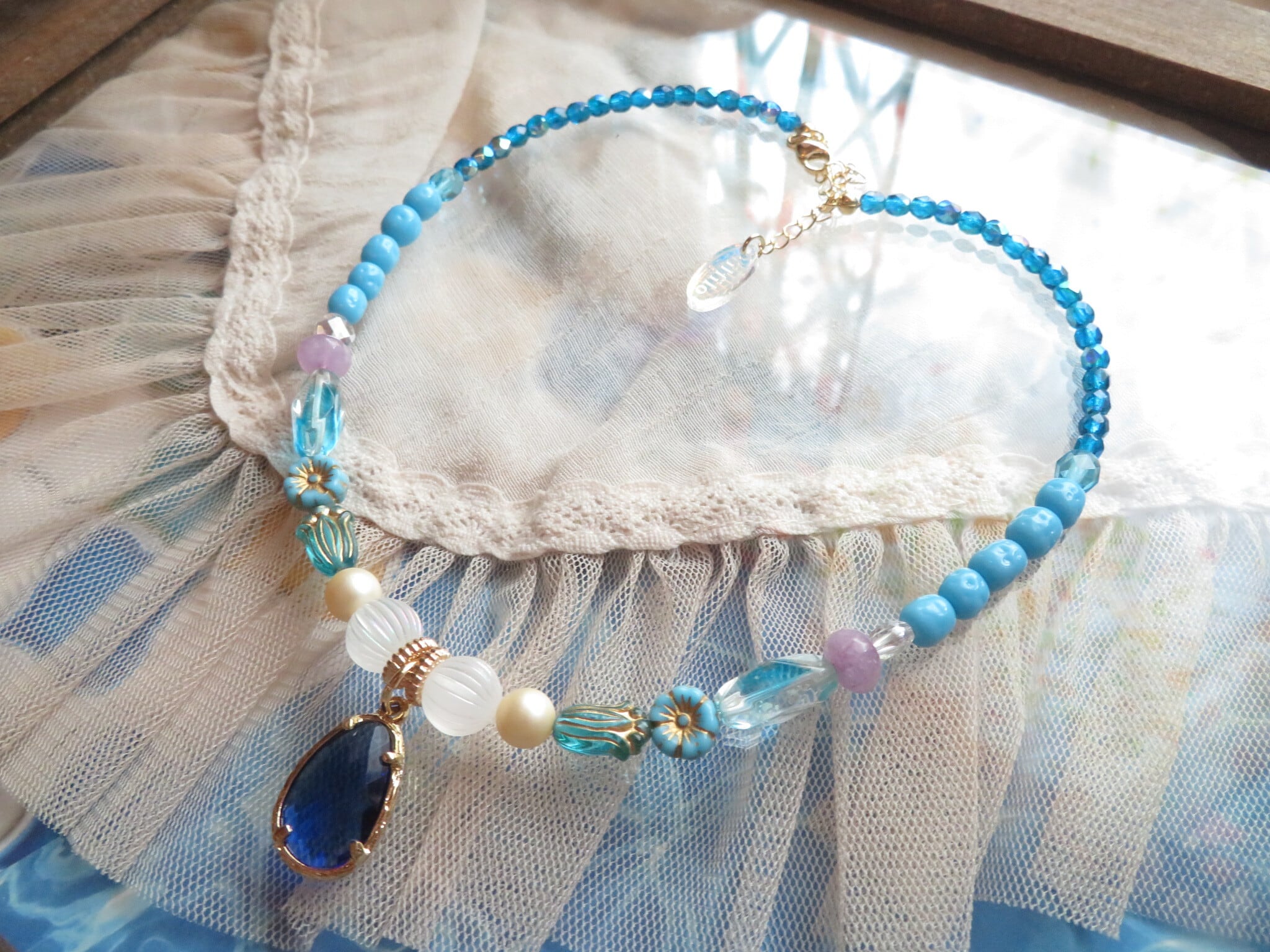 久しぶりのビーズネックレスシリーズです。今回は海をイメージして生き物や青いオリエンタルなトップなどたくさんのビーズを使って海の底の宝箱を想像しています。