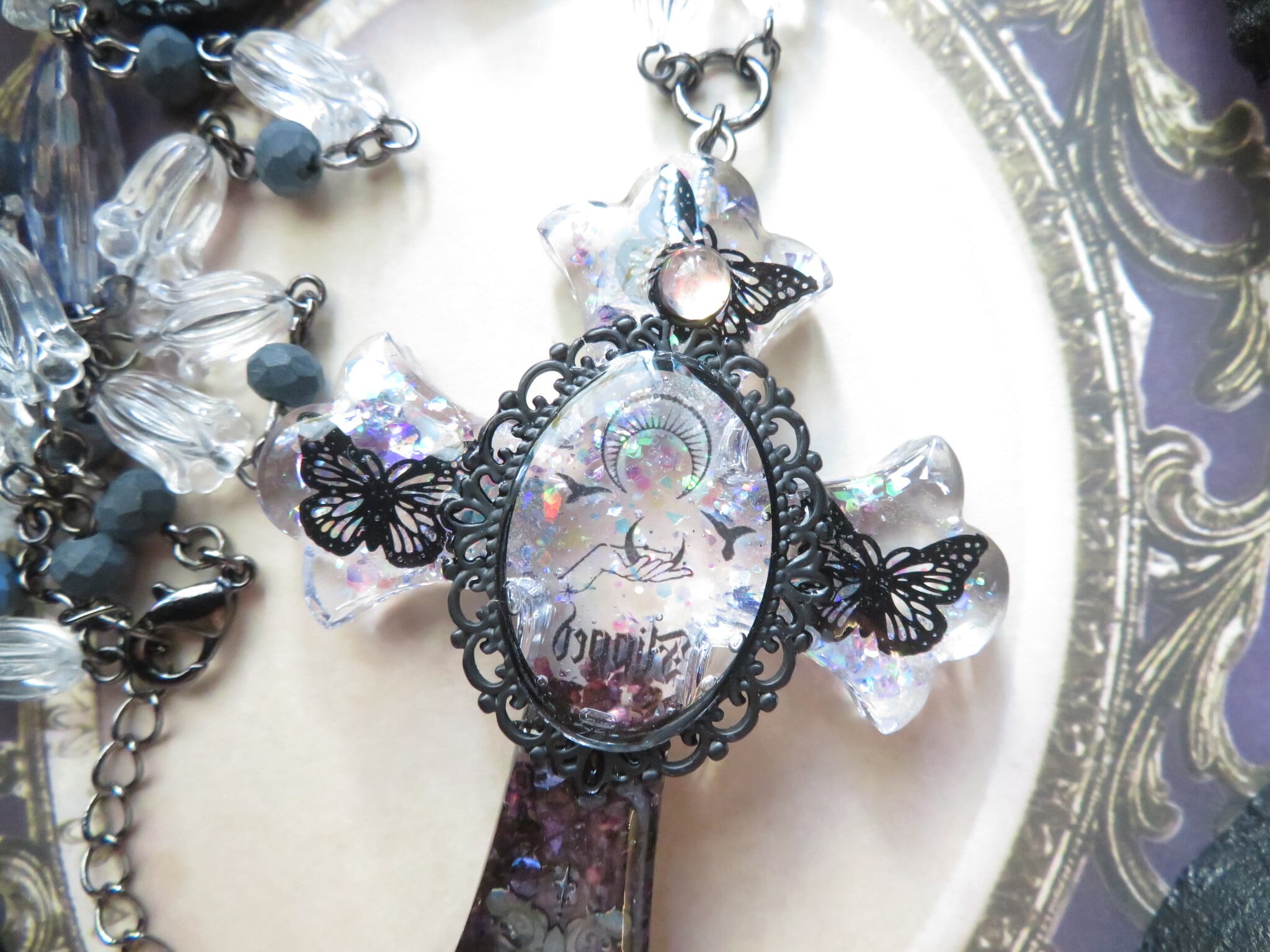 昨年のゴッシクより再販です。こちらのクリアブラックのゴシックデザインは、シンプルながらも目を引く存在感を持っています。ブラックの透明感がエレガントで、大人の雰囲気を演出します。十字架にはカラーモス、ラメなどが入っています。