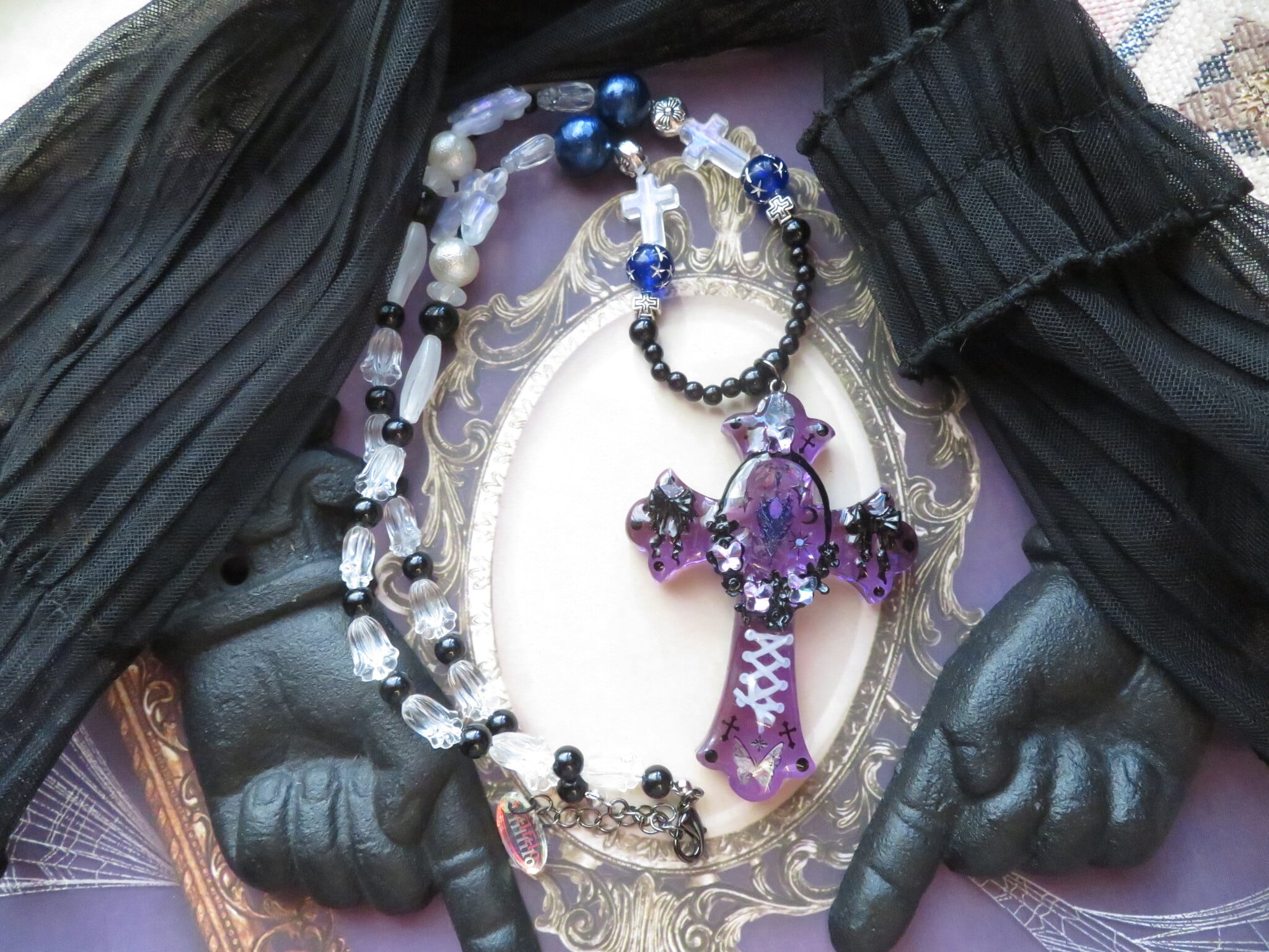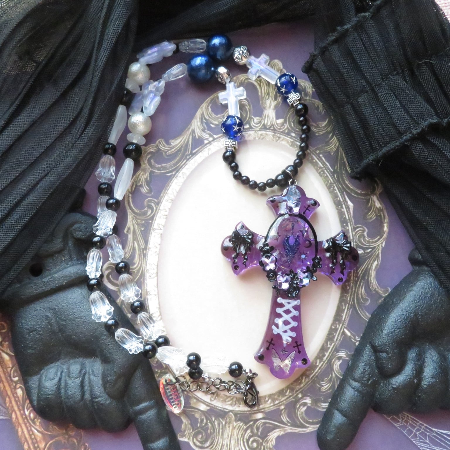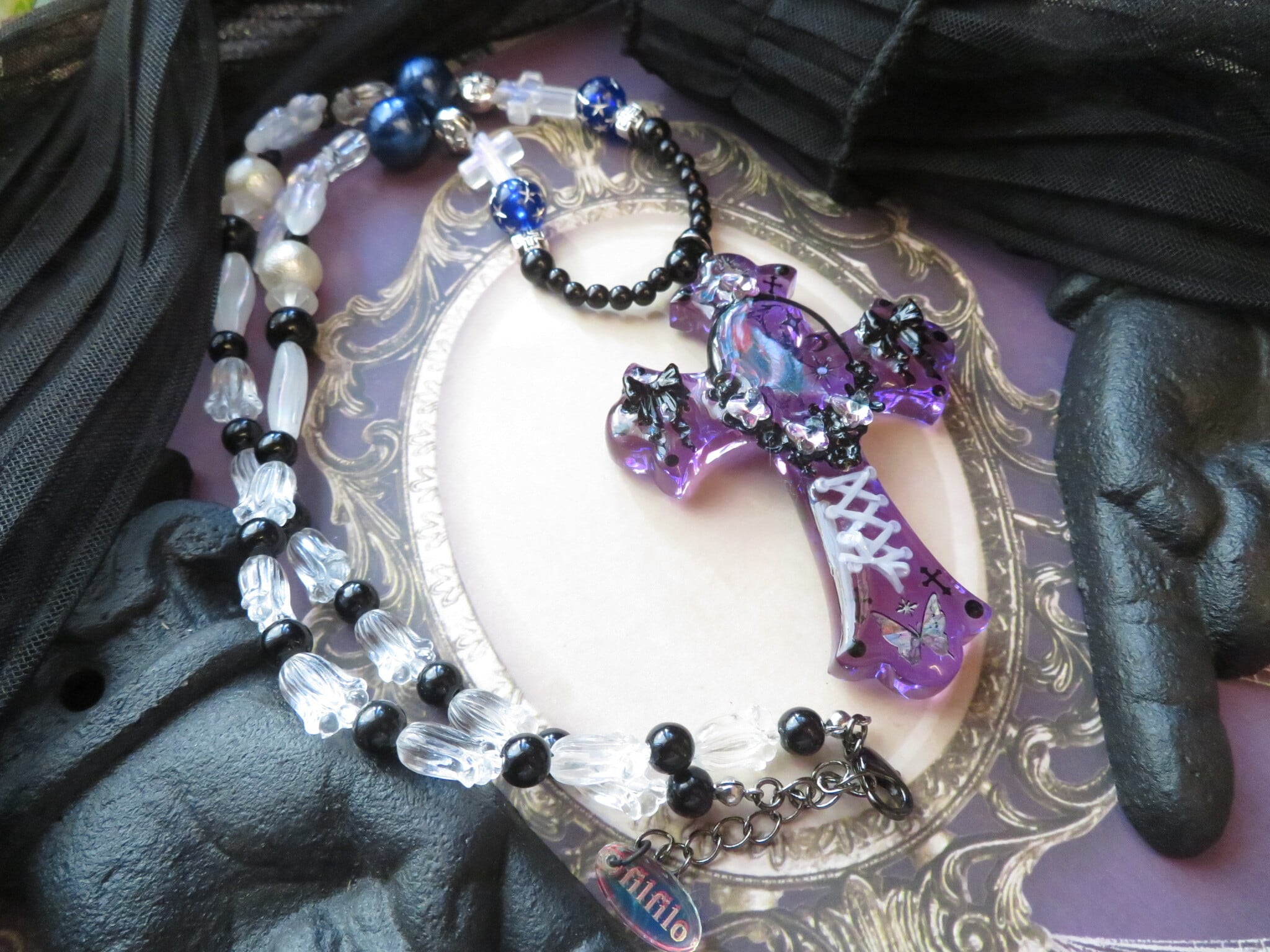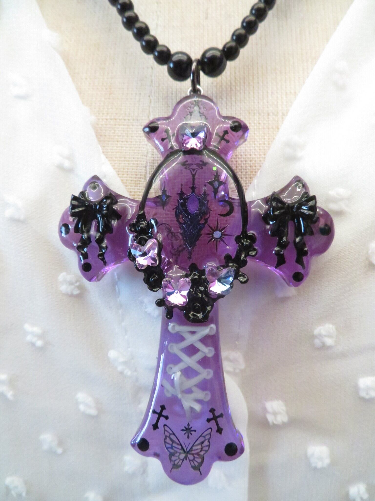 こちらは新作になります。装飾十字架ゴシックバタフライは、独特のデザインとエレガンスが魅力の一品です。ゴシックな雰囲気を持ちながら、バタフライのモチーフが優雅さを演出しています。バタフライのクリスタルの華やかさが神秘的です。チェーン部分にも蝶を使っています。