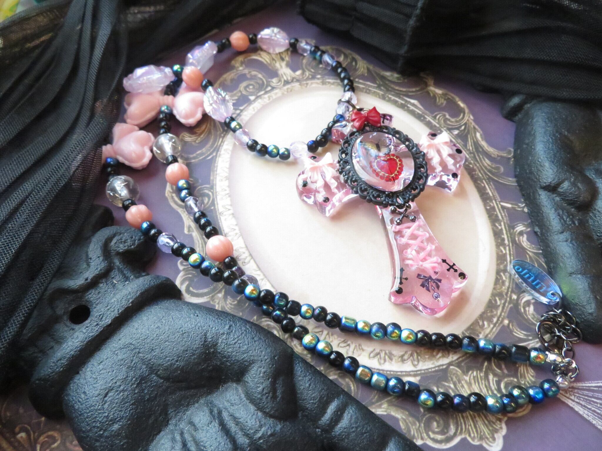 こちらは新作になります。装飾十字架 ゴシック 編み上げリボンは、独特のデザインとゴシックな魅力が詰まった一品です。編み上げたリボンが存在感を放ち、どこか神秘的な雰囲気を演出しています。リボンの柔らかな曲線が、洗練されたエレガンスを加えてくれます。