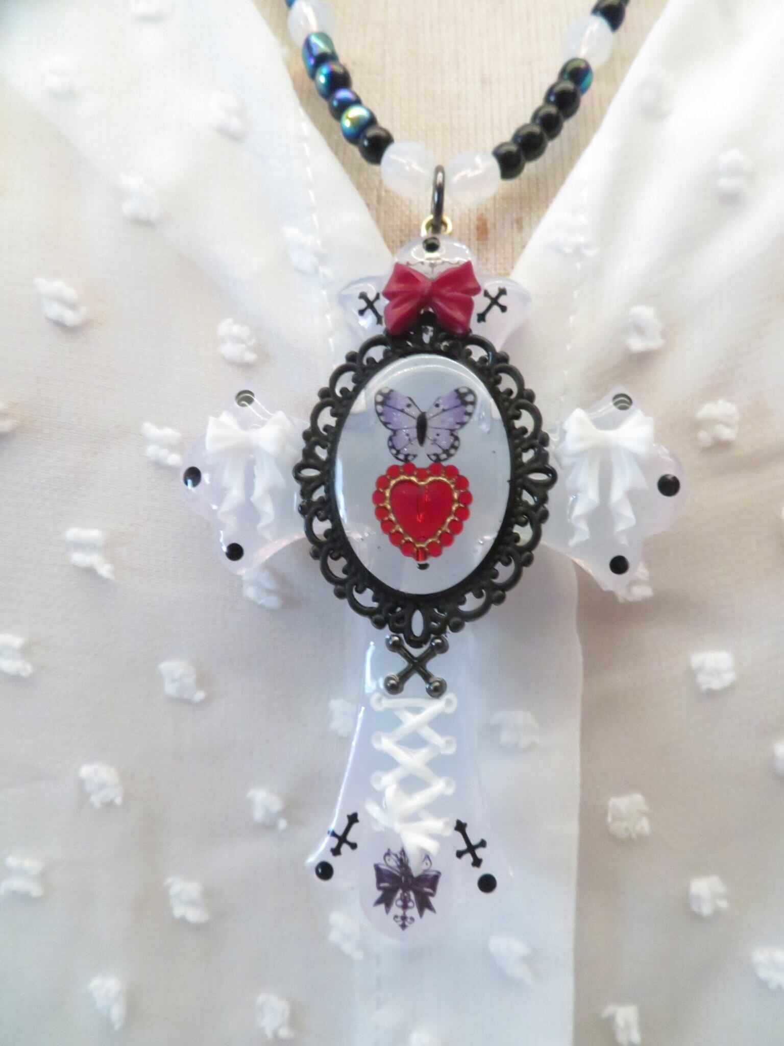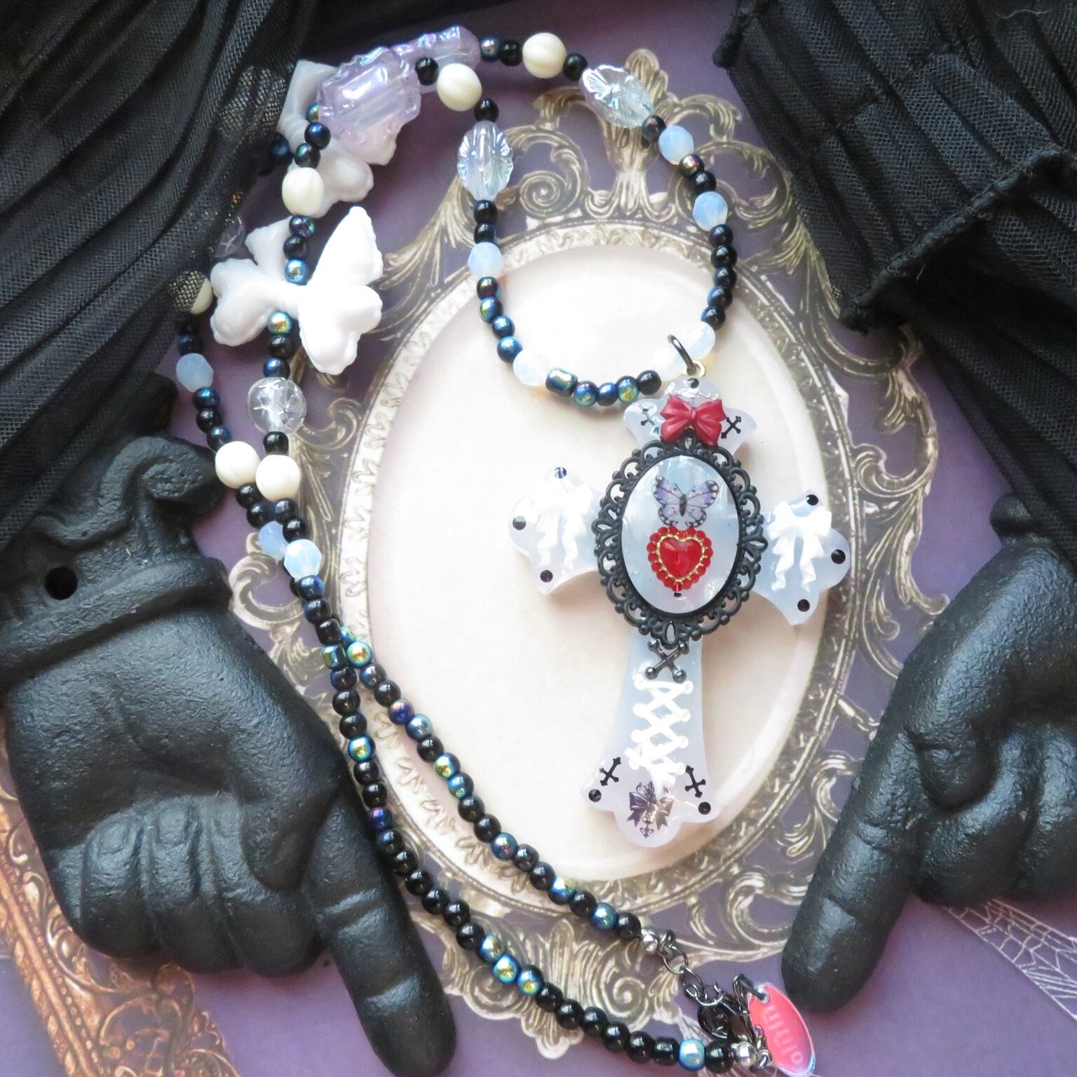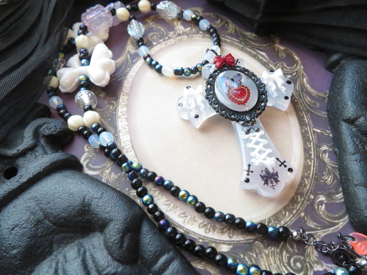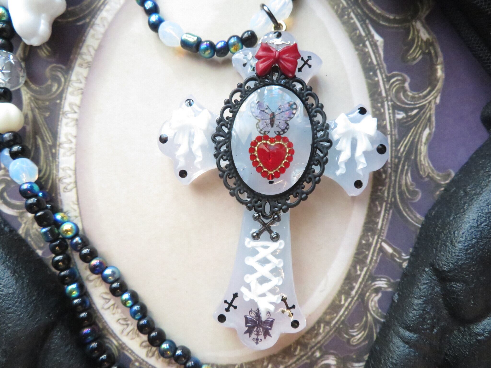 こちらは新作になります。装飾十字架 ゴシック 編み上げリボンは、独特のデザインとゴシックな魅力が詰まった一品です。編み上げたリボンが存在感を放ち、どこか神秘的な雰囲気を演出しています。リボンの柔らかな曲線が、洗練されたエレガンスを加えてくれます。※十字架の色はミルキーホワイト