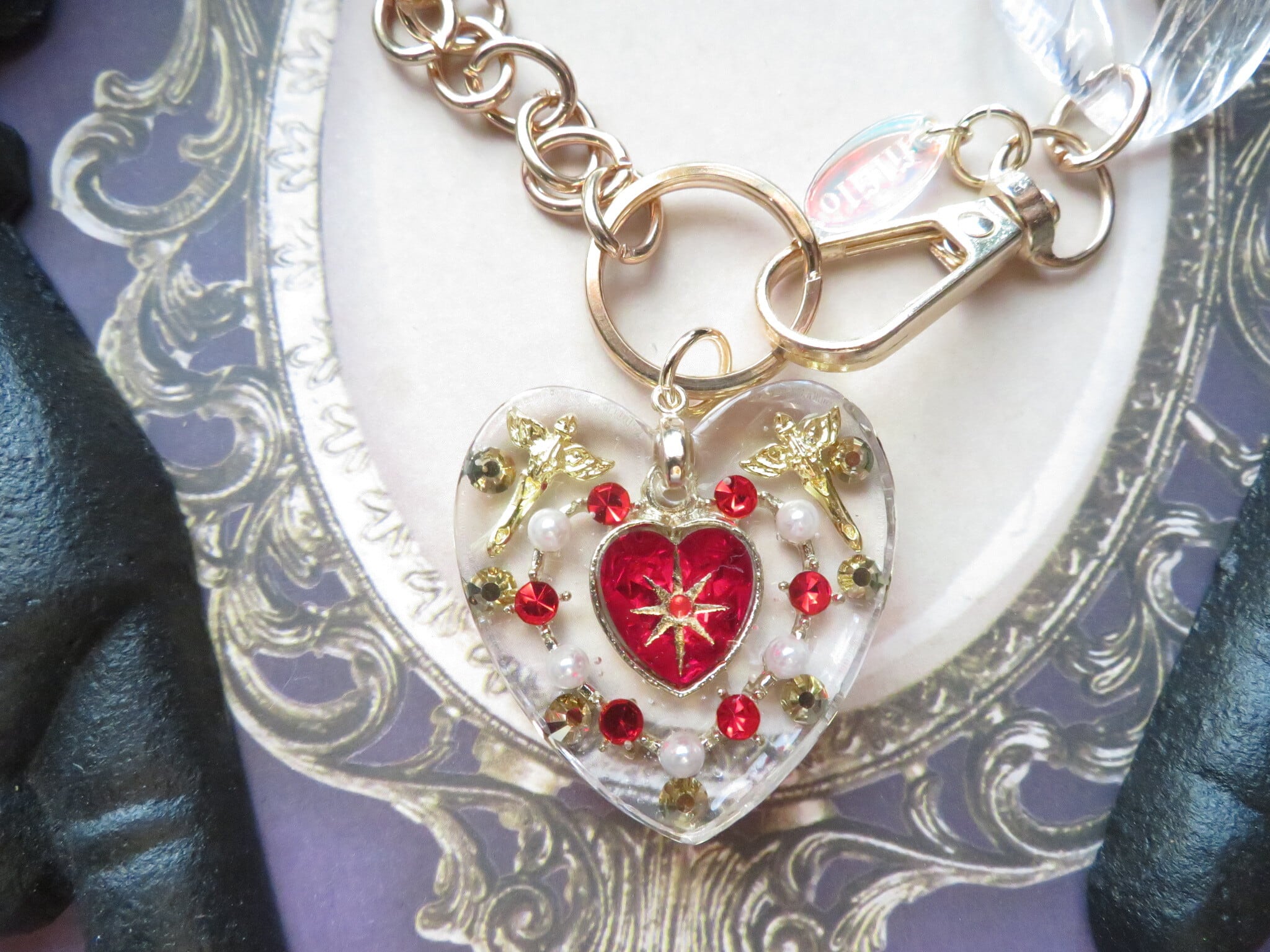 新作のハートバッグチャームです。こちらはすべてパーツをモールドの中に閉じ込めたシリーズになります。金色のチェーンと銀のチェーンがありますのでお写真をよくご確認ください。トップの金具色はすべて金色になります。
