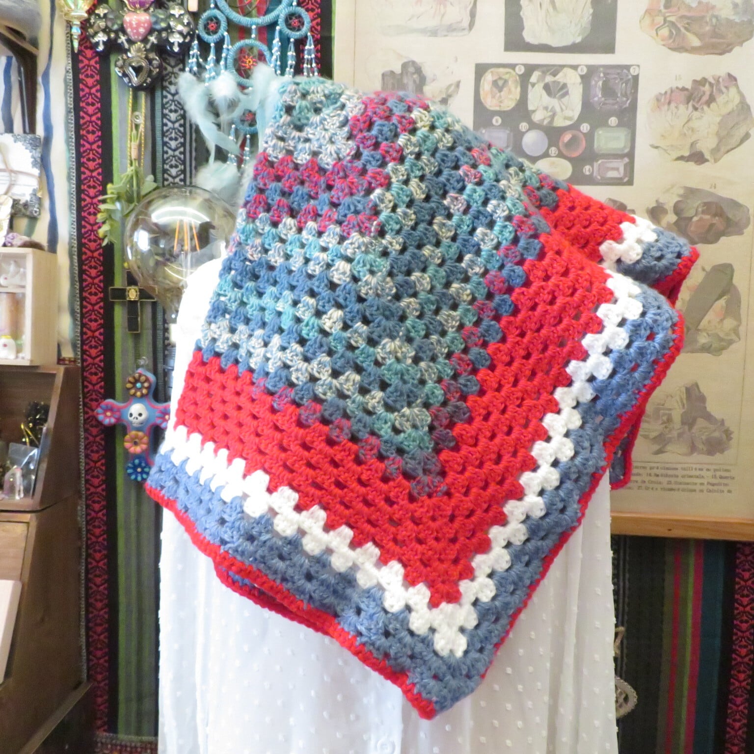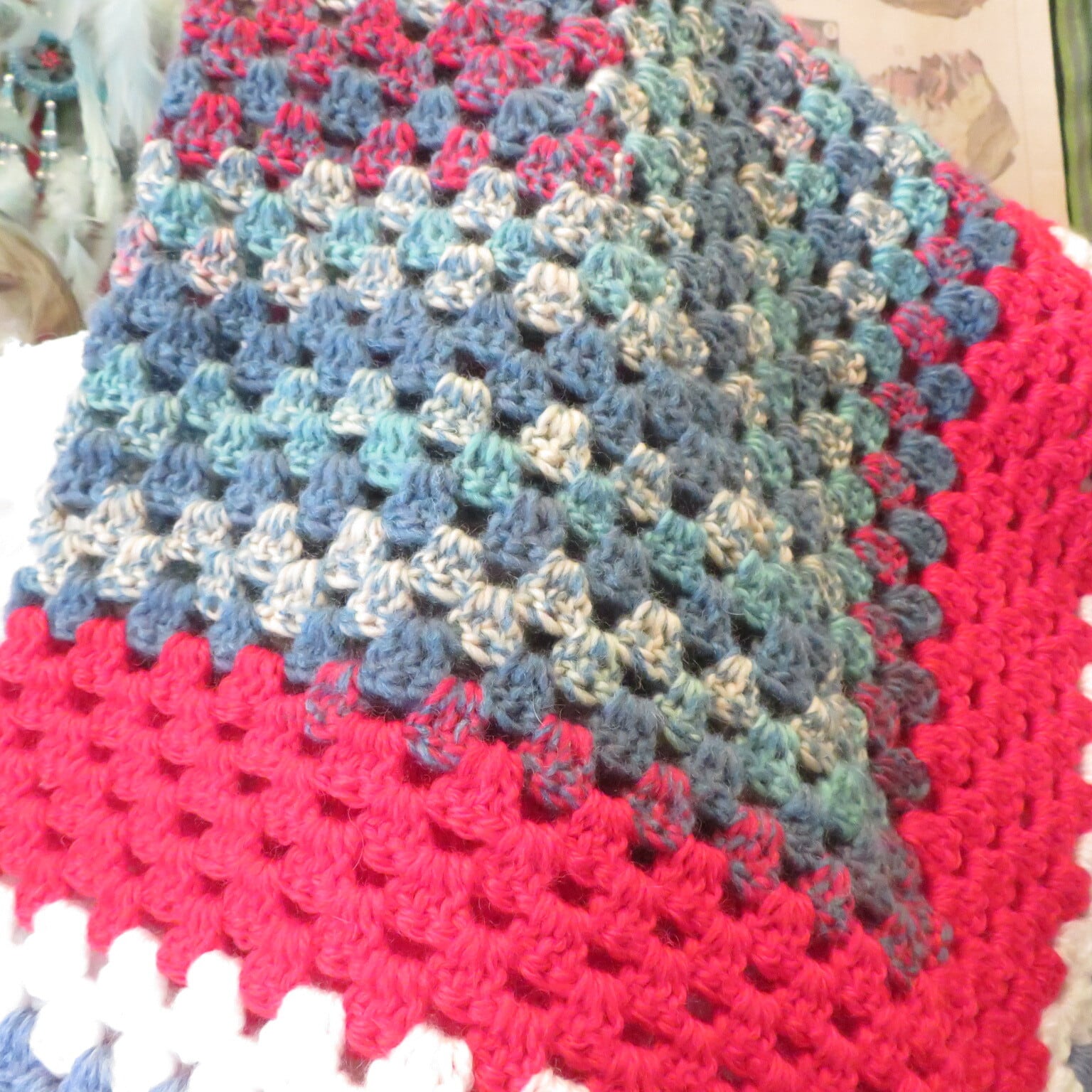 手編みのブランケットです、かぎ針編みでグラニースクエアという四角に大きくしていく編み方をしています。昔からある伝統的な形です。私なりの感覚でカラフルで可愛くしてみました!