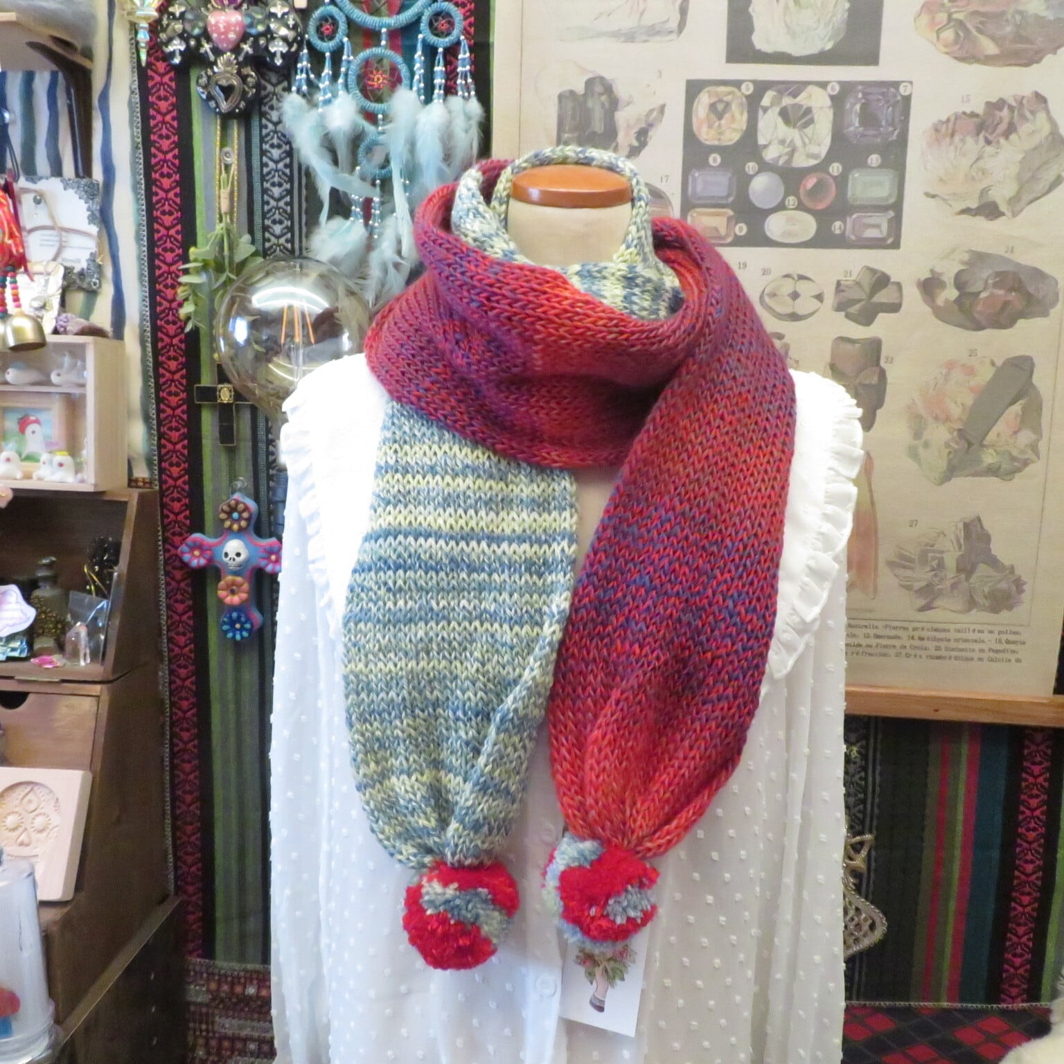 今年初登場のロングフラーです、機械編みでバイカラーになるように編みました。長いのでリボン巻きにすることもできます。ポンポンはミックスカラーで可愛らしく。