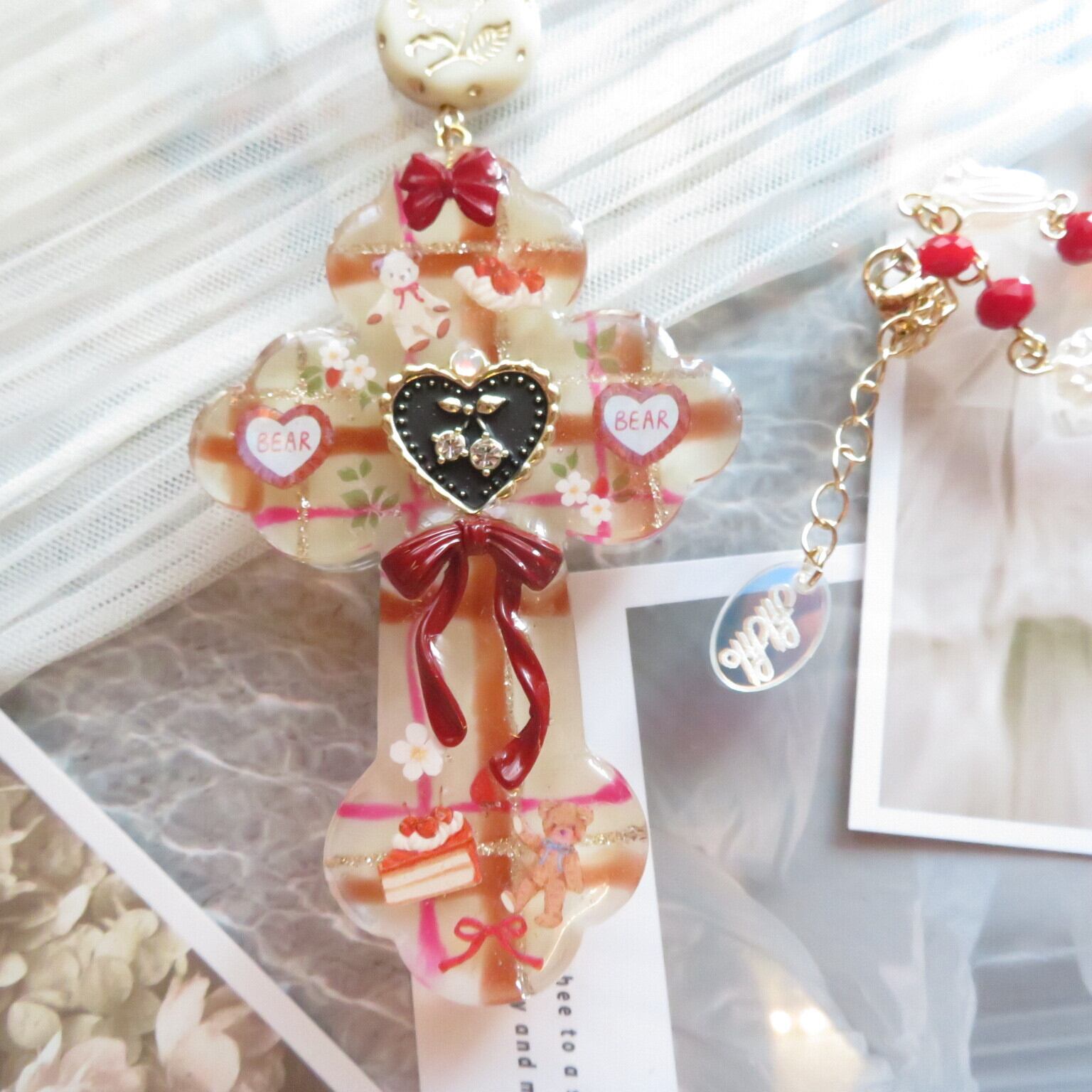 チェーン部分もトップに合わせてミルキーな赤と白でまとめています。素材はオータムカラーですが通年使えるデザインだと思うのでくまさん好きな方に届きますように♪