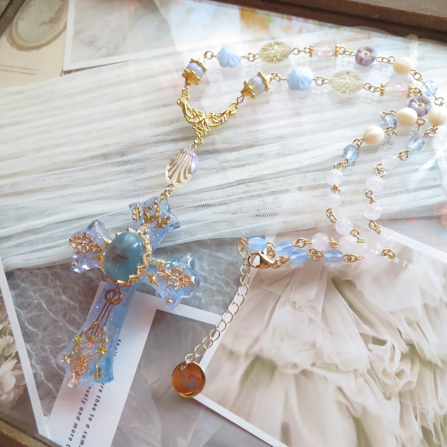 個展に向けて作った久しぶりの宝石シリーズです、今回はたくさんのいい石を仕入れられました!こちらはメインにアクアマリンを使用しています。こちらにあわせてベースカラーはブルーとラメのグラデーションになっています。チェーンにもラベンダーアメジストやチェコビーズなどを使って贅沢な仕上がりになっています。