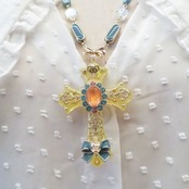 こちらも個展用から初登場の組み合わせです。お花のようなクリスタルの台座を使って少しレトロのようなビタミンカラーの可愛い十字架に仕上がりました。
