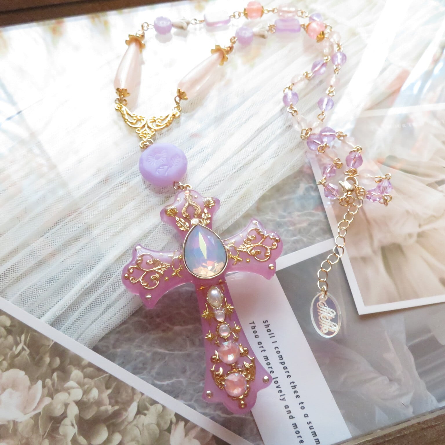ベースはミルキーピンクに大粒の貴和クリスタルです。こちらはチェーンのビーズ部分にヴィンテージのアレキサンドライトのビーズをたくさん使用しています(メイントップの上の大きなラベンダーカラーのビーズもアレキサンドライトです)
