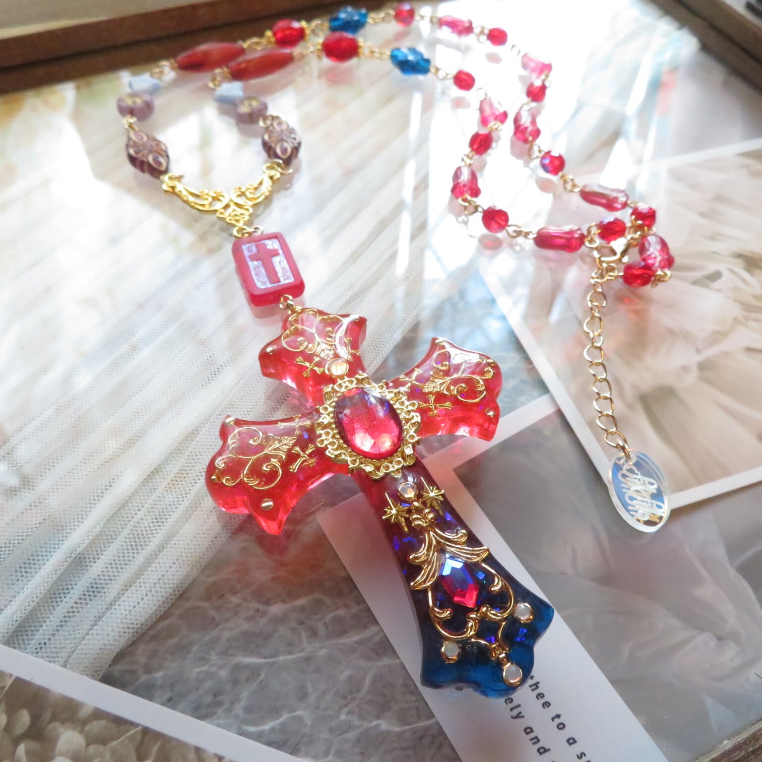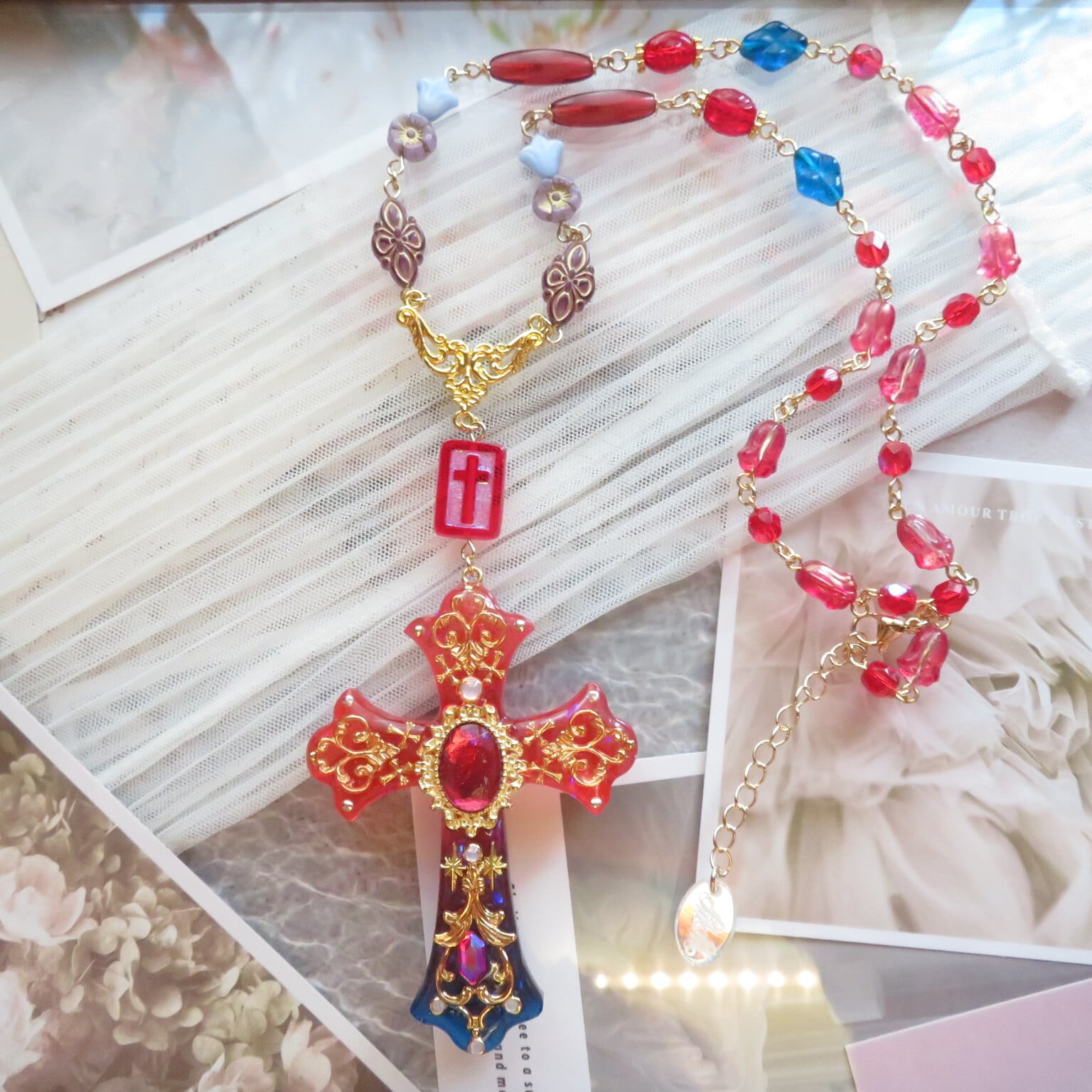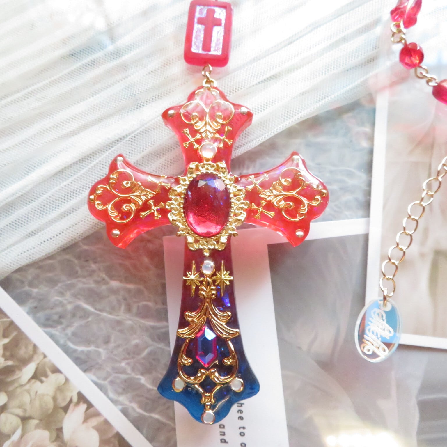 ドラゴンズブレスといえばというお手本のような赤青のカボションをメインにしています。こちらに合わせてベースの十字架も赤とブルーのグラデーションにしています。お写真だと伝わりにくいかもしれませんが、こちらの中に入っているホログラムが普通は赤に見えるのですが角度で青にチラチラと見えるのがとてもドラゴンズブレスぽいなと思って使用しております。