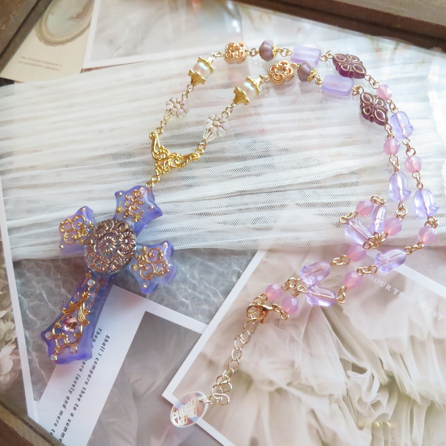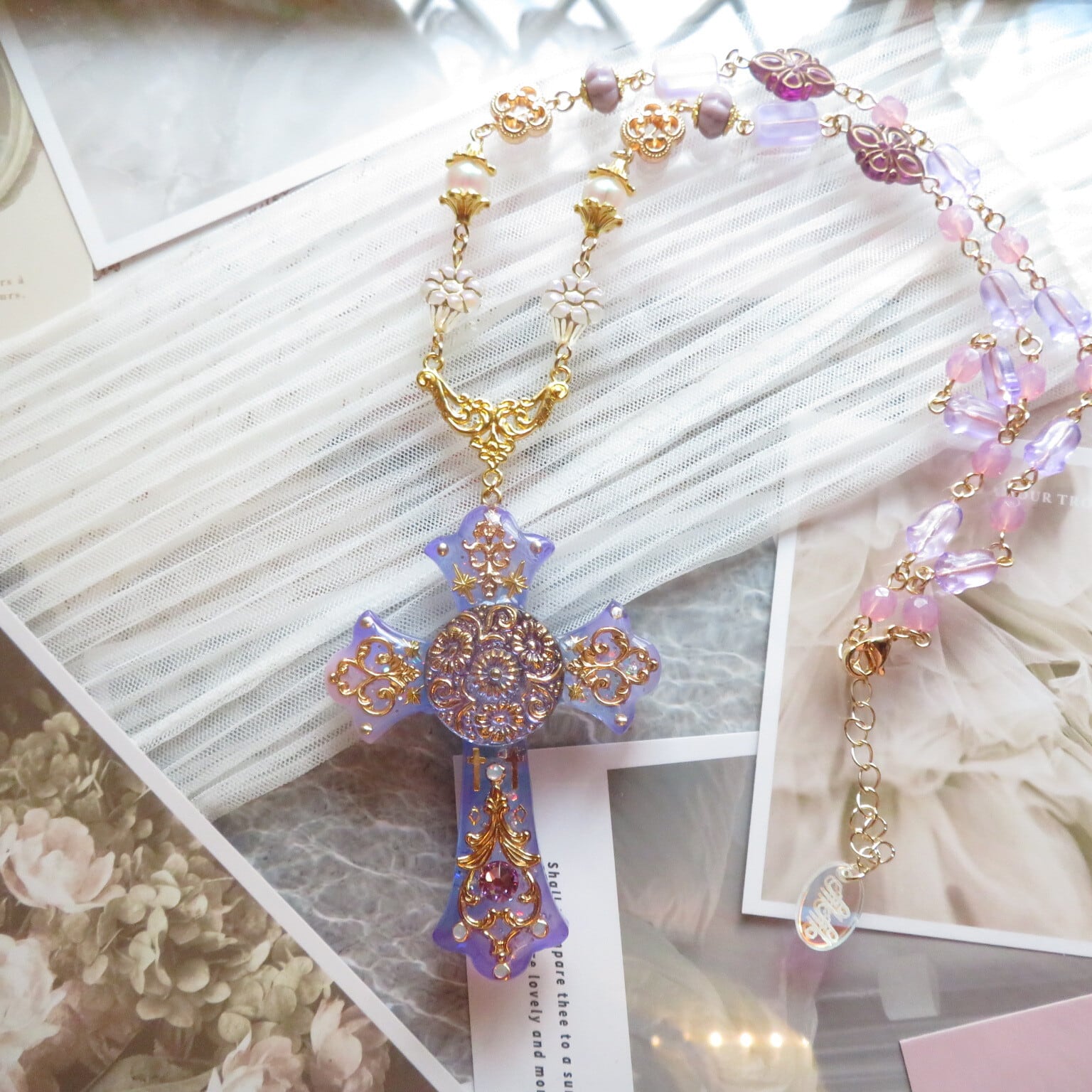 大きなチェコカボションを使用したシリーズの十字架です。チェーンやベースの十字架もメインに合わせています。