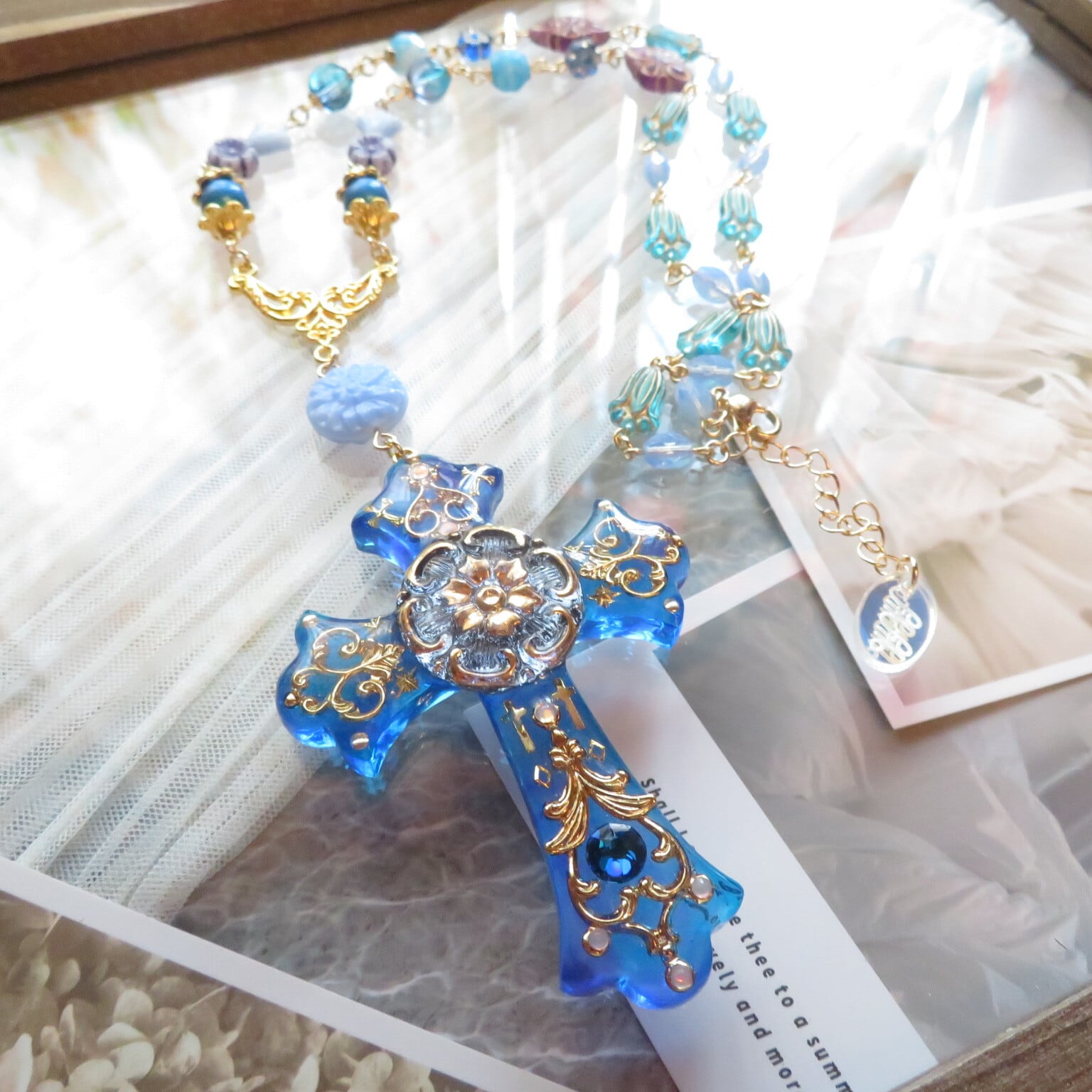 大きなチェコカボションを使用したシリーズの十字架です。チェーンやベースの十字架もメインに合わせています。
