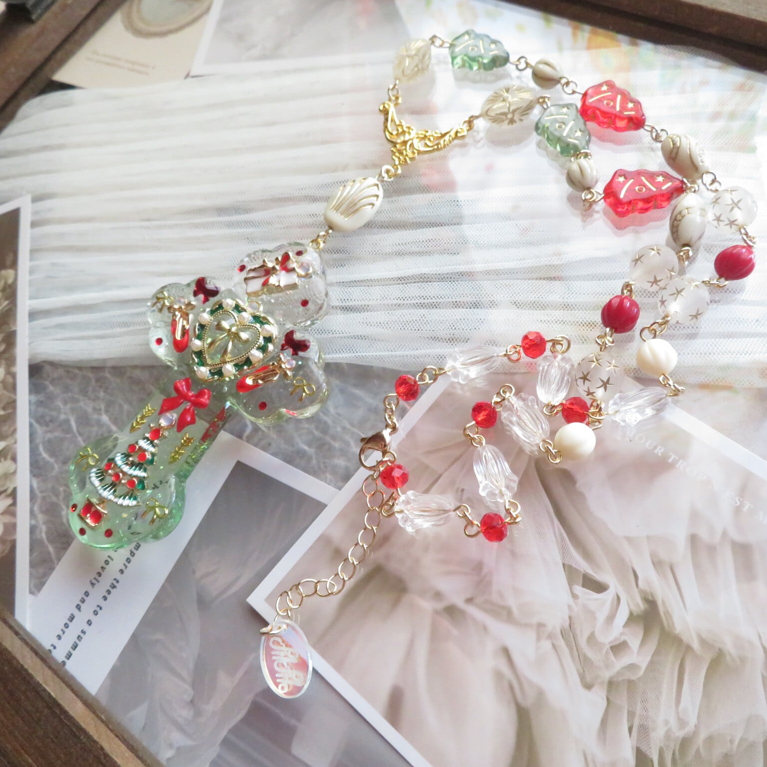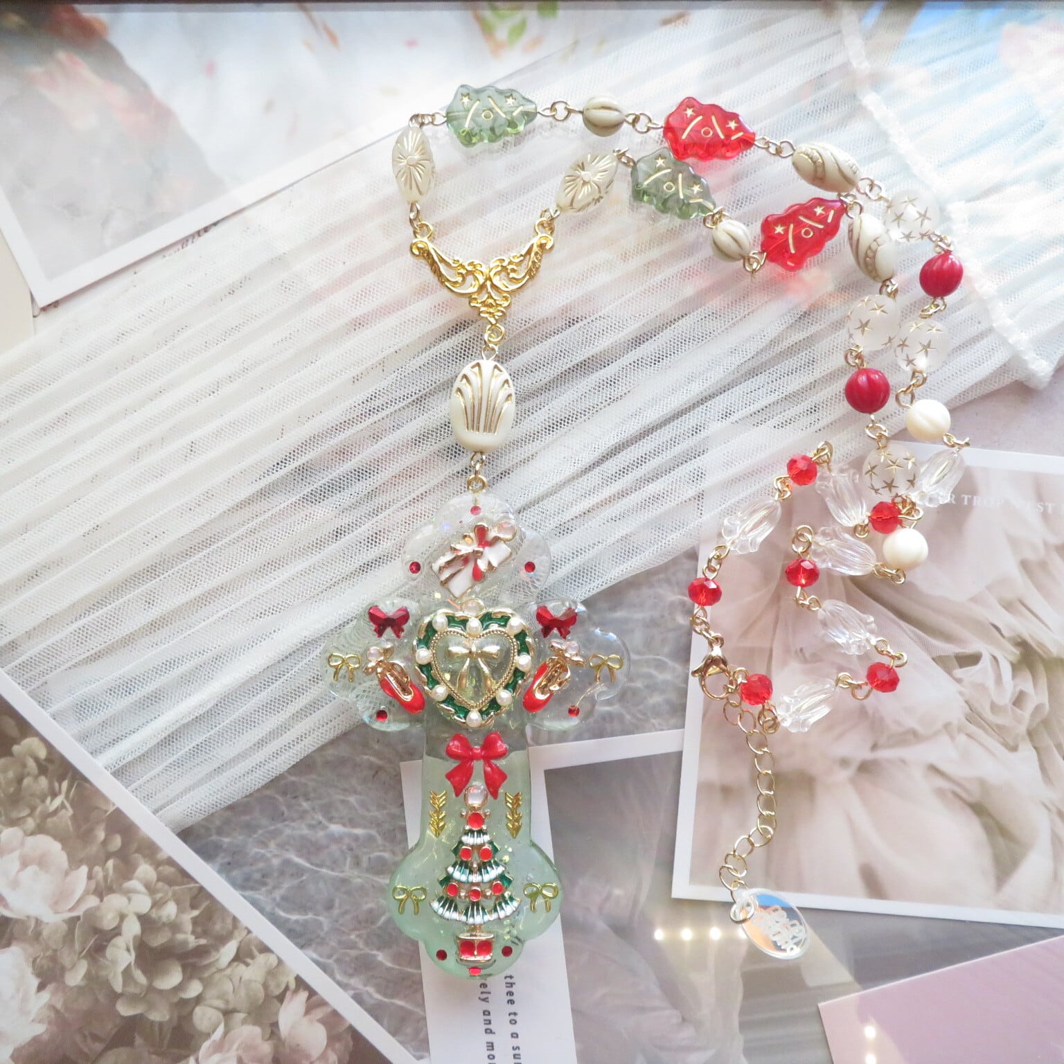 オリジナルモールドを使用しています。レジン十字架でのクリスマスモチーフははじめてかと思います。個展でも見ていただきのこり1点となりました。クリスマスは限定モチーフで短いかと思いますが赤や緑、チェックのお洋服、クリスマスモチーフのお洋服などとは相性抜群でございます。赤・緑・白の配色が大好きなため欲望が満たされたデザインになりましたがとても可愛いのでぜひ好きなかたのもとへ行ってくれたらいいなと思います。