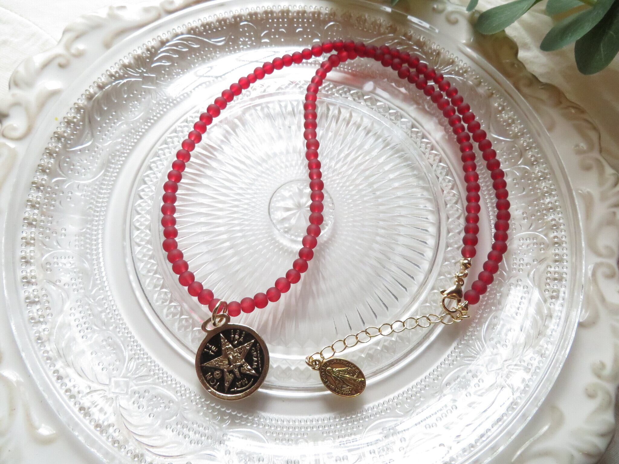 メキシコのチャームを使ったロングネックレスです。すりガラスのビーズを使って異国感を。シンプルですがとても可愛くて使いやすいです。チャームは裏表でデザインが違うのでどちらでもお使いになれます。