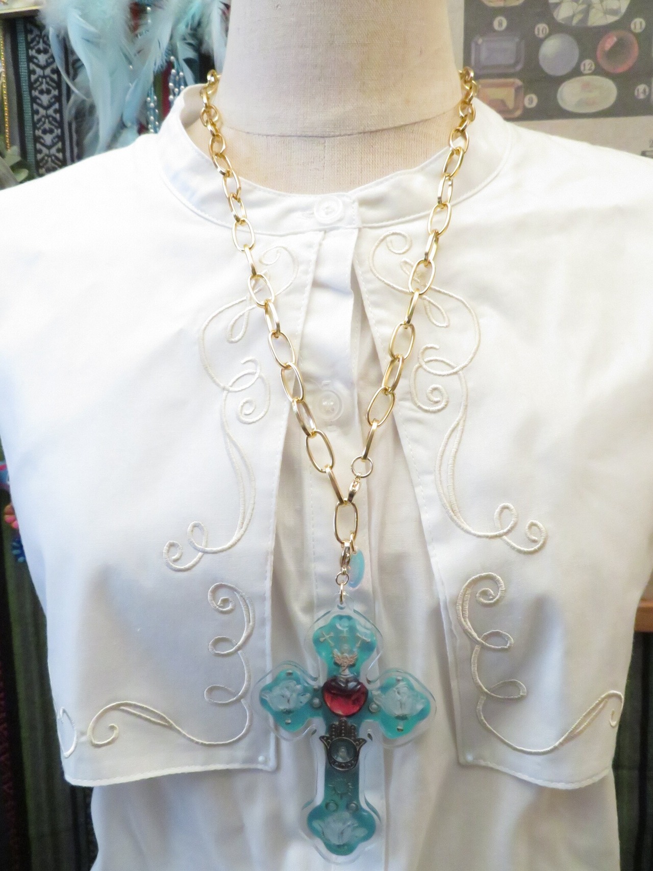 当店の人気商品のミラグロクロスからオリジナルのアクリル十字架を制作しました!実物よりも大きいのでかなりのインパクトです♪可愛いので少しネックレスにしてみました。アクリルなのでとても可愛いですよ。