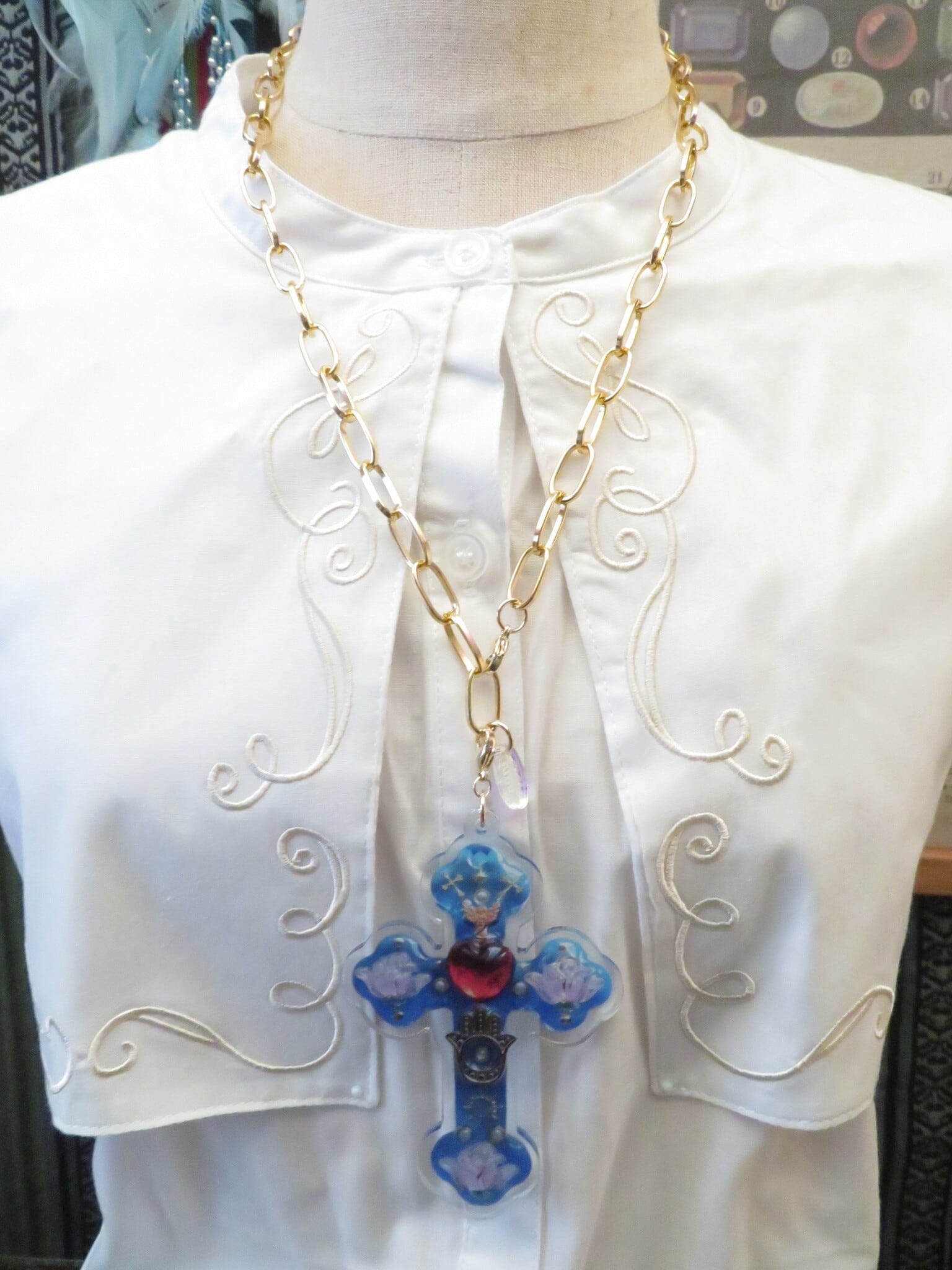 当店の人気商品のミラグロクロスからオリジナルのアクリル十字架を制作しました!実物よりも大きいのでかなりのインパクトです♪可愛いので少しネックレスにしてみました。アクリルなのでとても可愛いですよ。