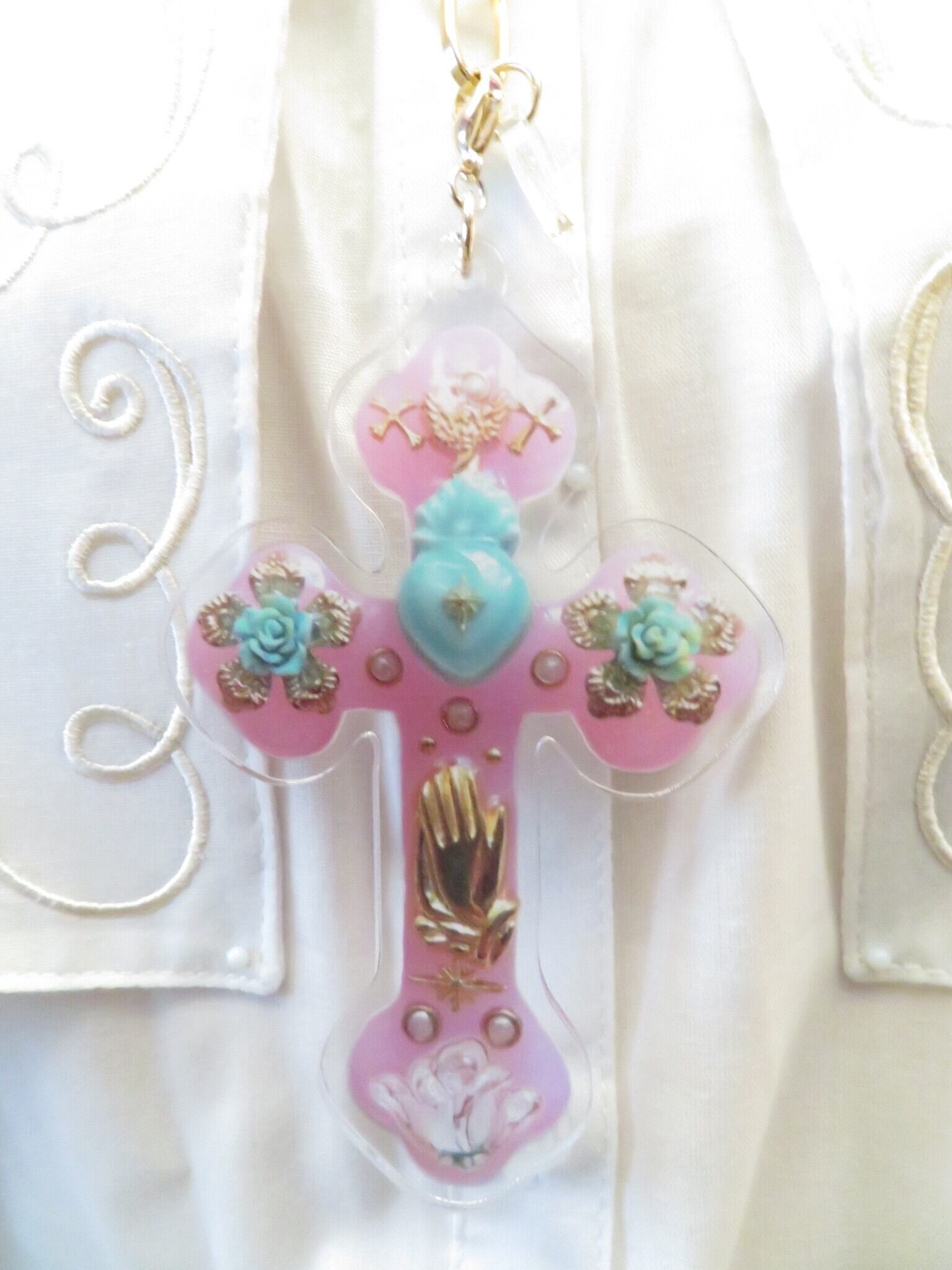 当店の人気商品のミラグロクロスからオリジナルのアクリル十字架を制作しました!実物よりも大きいのでかなりのインパクトです♪可愛いので少しネックレスにしてみました。アクリルなのでとても可愛いですよ。