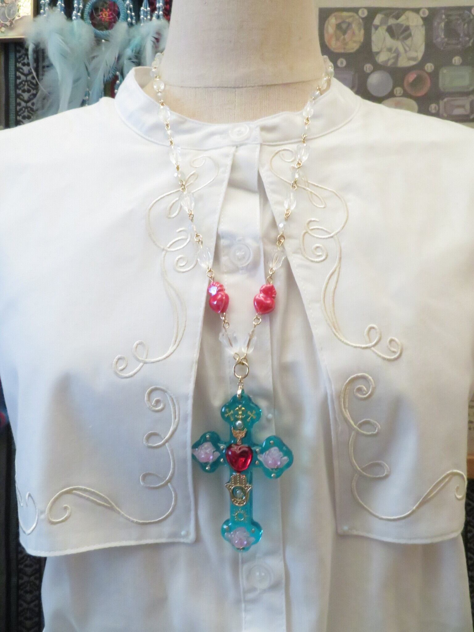 装飾十字架はメキシコのミラグロをインスパイアしたデザインが特徴的なアクセサリーです。さまざまなパーツが繊細にデザインされ、きらめくような輝きを放ちます。