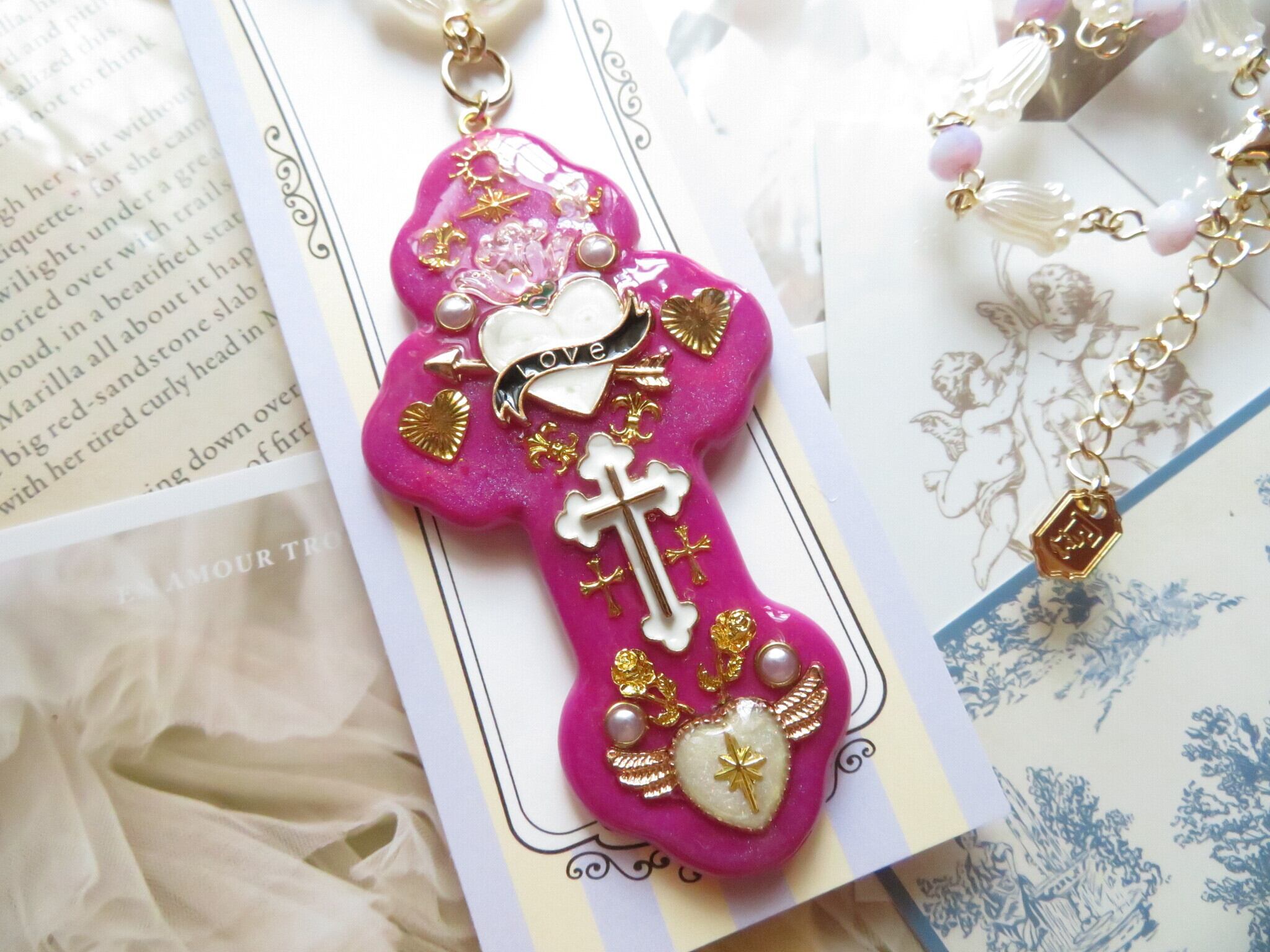オリジナルの装飾十字架です。メキシコのミラグロをインスパイアしたデザインが特徴的なアクセサリーです。さまざまなパーツが繊細にデザインされクレイとレジンを使用し秘密のパールを仕込むことで陶器のような独自の風合いを持っています。