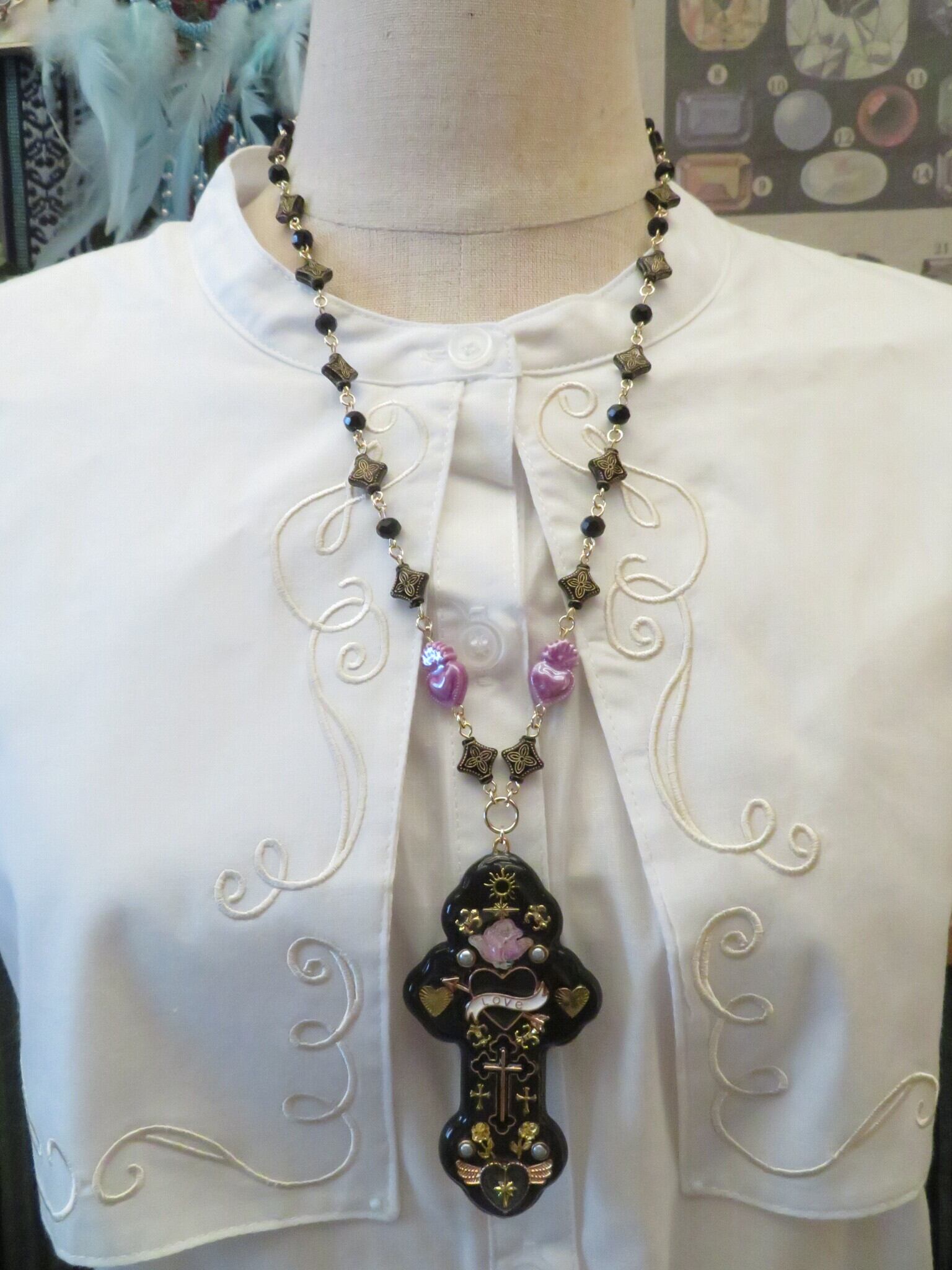 オリジナルの装飾十字架です。メキシコのミラグロをインスパイアしたデザインが特徴的なアクセサリーです。さまざまなパーツが繊細にデザインされクレイとレジンを使用し秘密のパールを仕込むことで陶器のような独自の風合いを持っています。
