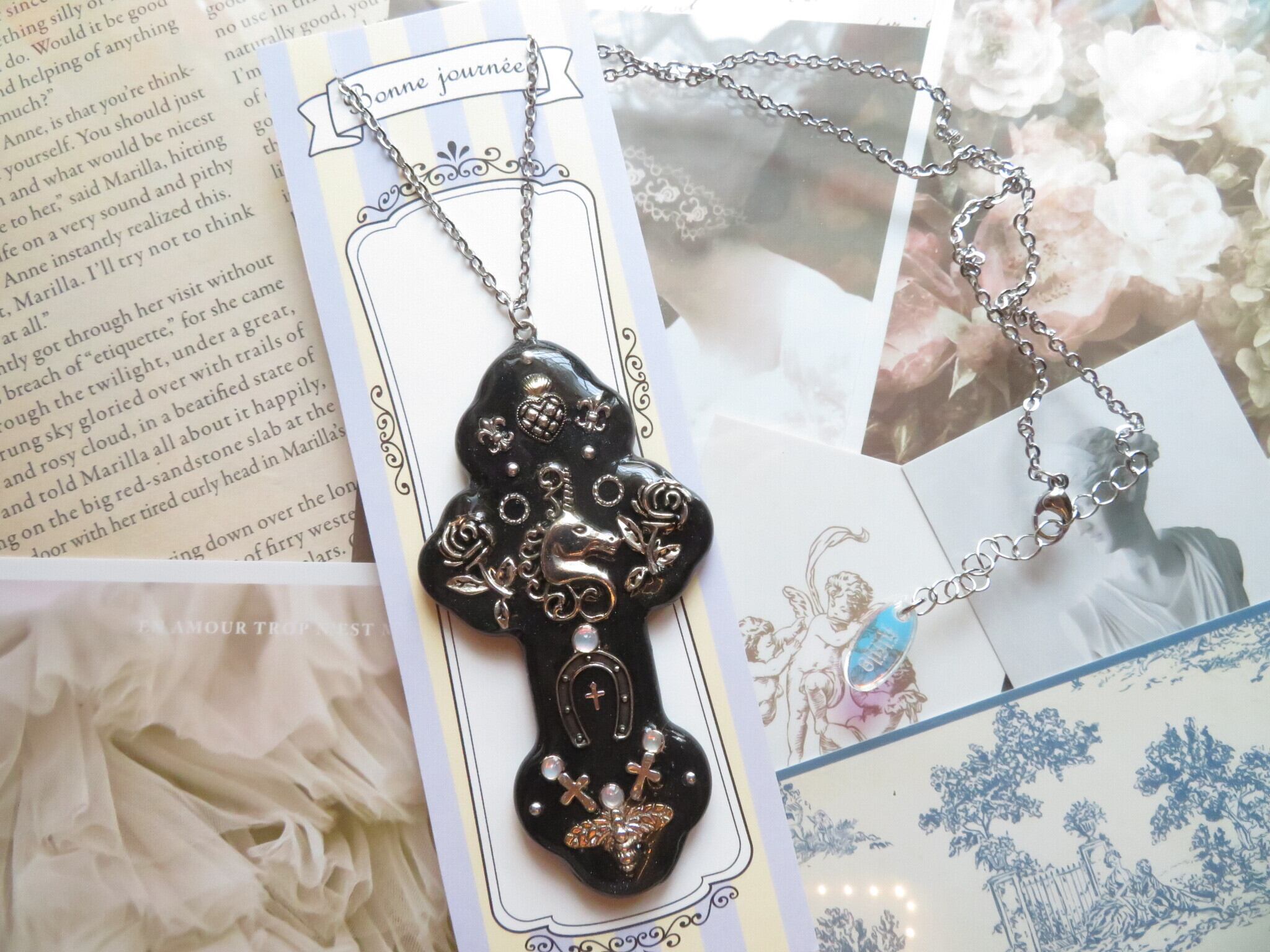 オリジナルの装飾十字架です。メキシコのミラグロをインスパイアしたデザインが特徴的なアクセサリーです。さまざまなパーツが繊細にデザインされクレイとレジンを使用し秘密のパールを仕込むことで陶器のような独自の風合いを持っています。