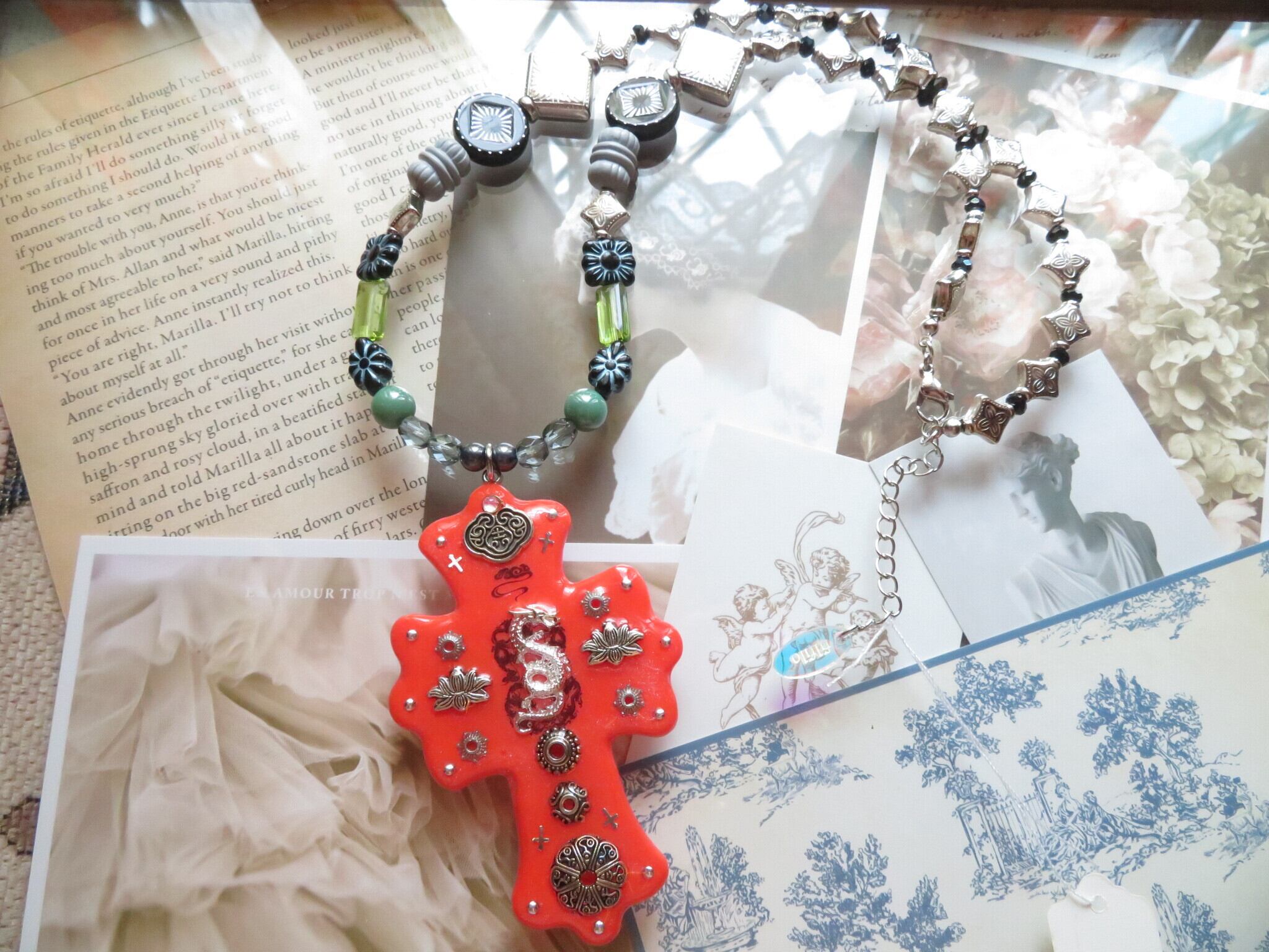オリジナルの装飾十字架です。メキシコのミラグロをインスパイアしたデザインが特徴的なアクセサリーです。さまざまなパーツが繊細にデザインされクレイとレジンを使用し秘密のパールを仕込むことで陶器のような独自の風合いを持っています。