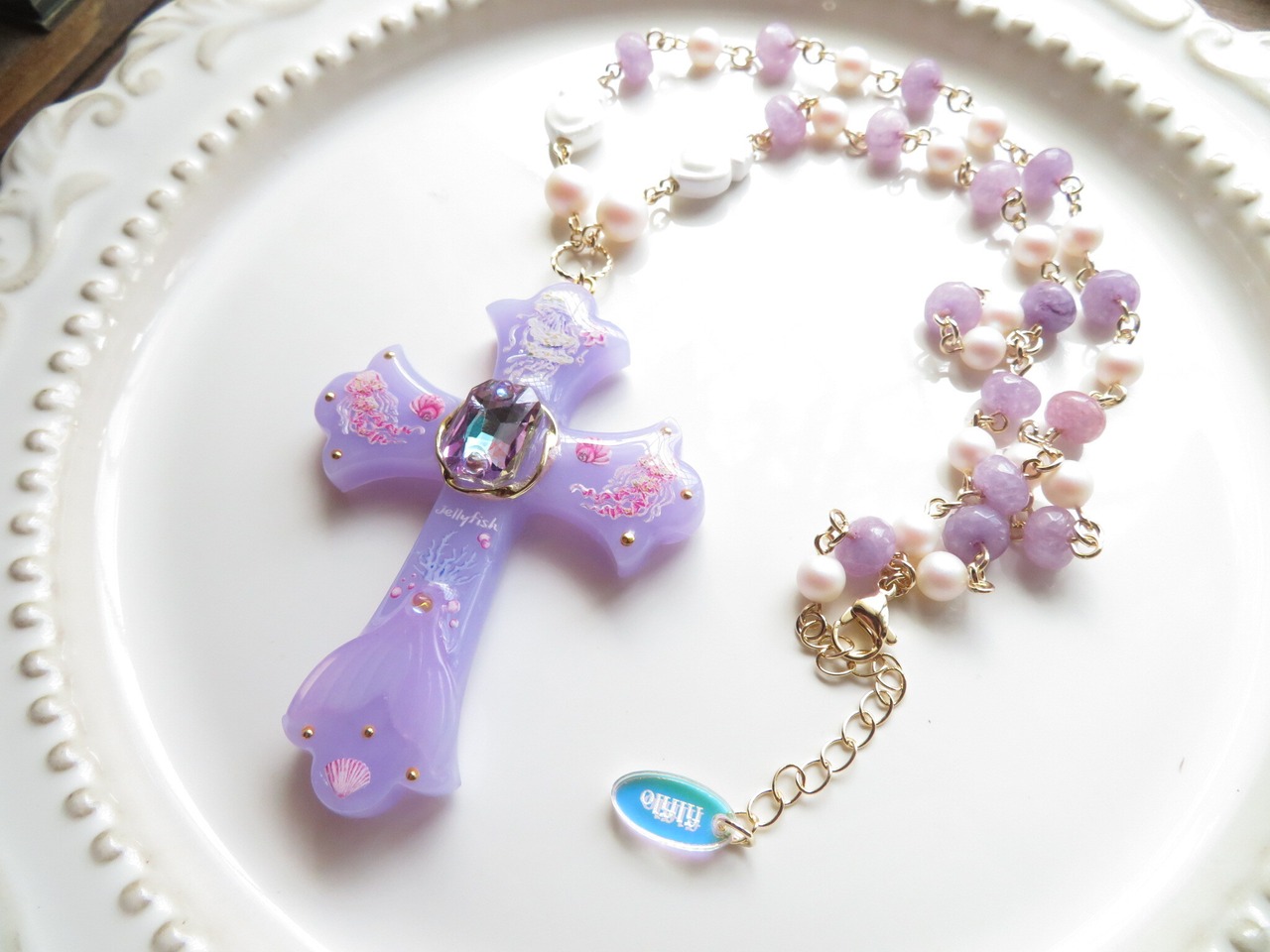 オリジナルエンドパーツ使用。チェーン部分に合成石、ガラスパール使用。