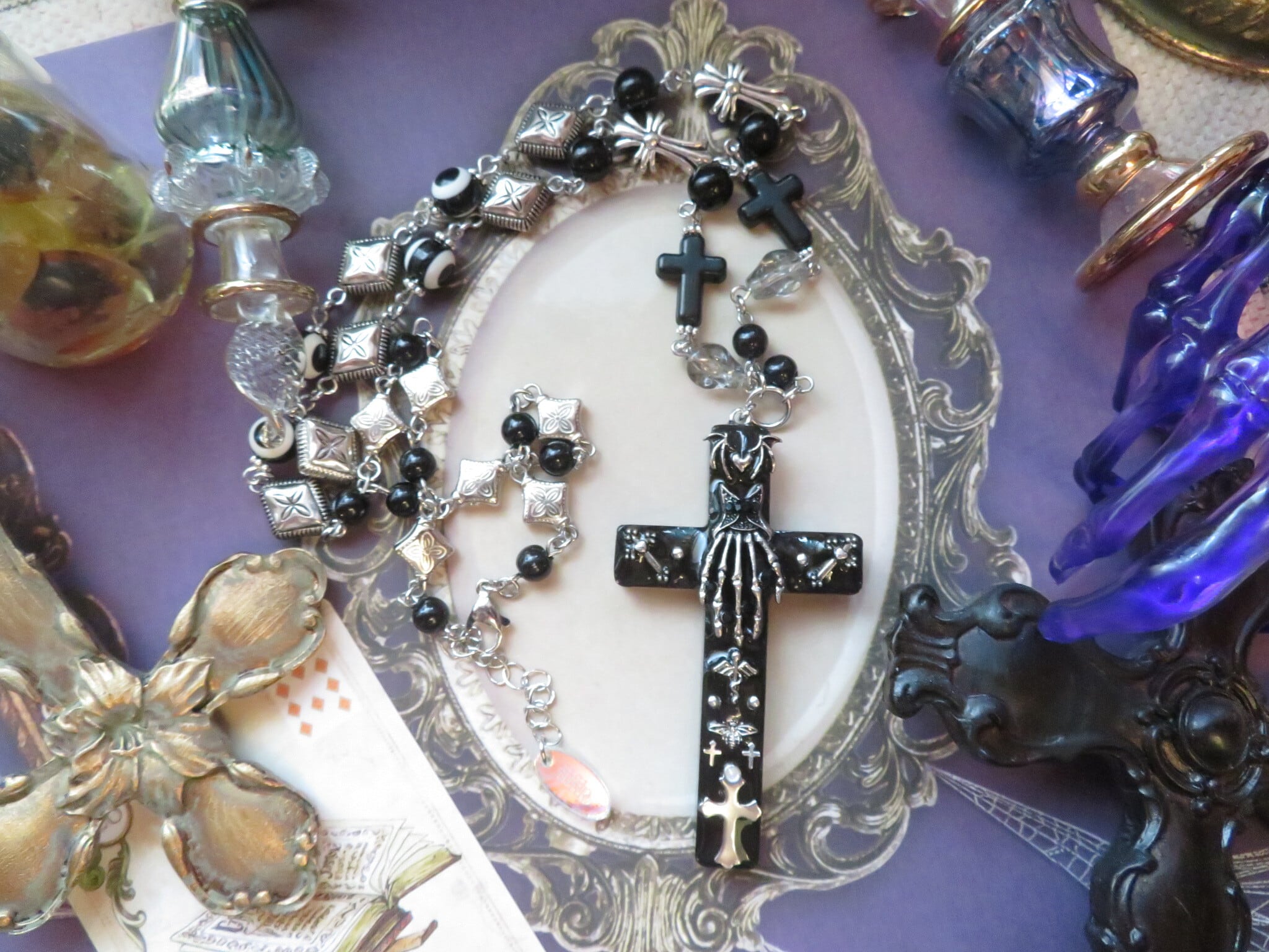 ブラックとシルバーでとことんかっこいいハロウィンな感じのデザインにしてみました。もちろんシーズン以外にも使えるデザインです!存在感のあるゴシックなデザインの装飾十字架が、シックでミステリアスな雰囲気を演出します。深いブラックが際立つこのネックレスは、どんなコーディネートにもぴったりです!