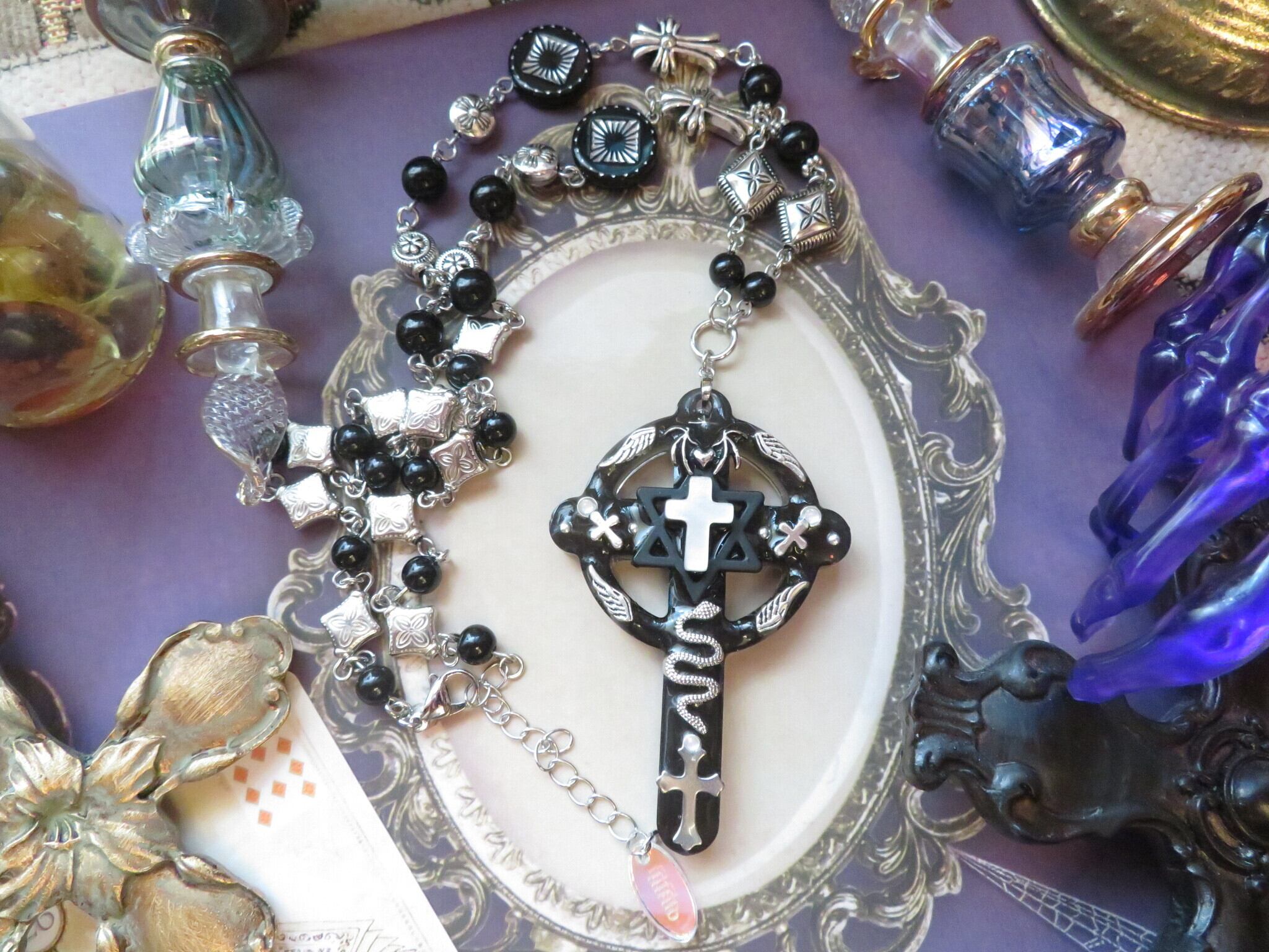 ブラックとシルバーでとことんかっこいいハロウィンな感じのデザインにしてみました。もちろんシーズン以外にも使えるデザインです!存在感のあるゴシックなデザインの装飾十字架が、シックでミステリアスな雰囲気を演出します。深いブラックが際立つこのネックレスは、どんなコーディネートにもぴったりです!