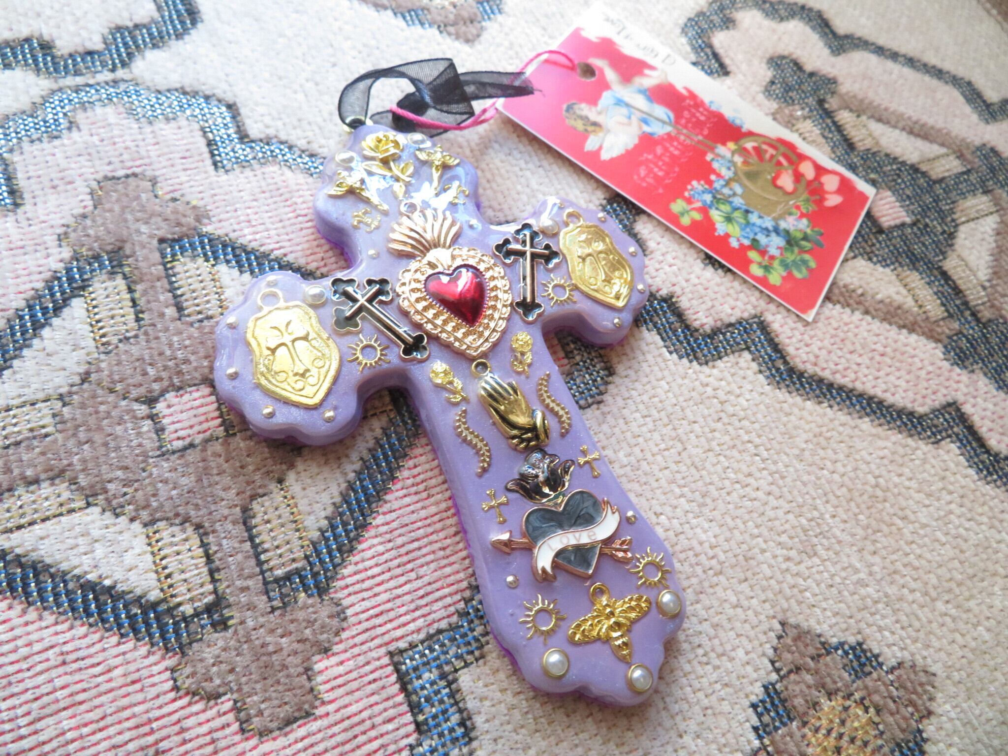 今回初登場の特大の壁掛けです。皆様の壁掛けのリクエストから制作させていただきました。もともとメキシコのミラグロという壁掛けから影響を受けてネックレスにデザインを落とし込んでいたので、私が壁掛けを作るのは何か違うのでは…と思っていて作ってこなかったのですが、私の感性のままに元のものとは違うテイストになるように作っています。