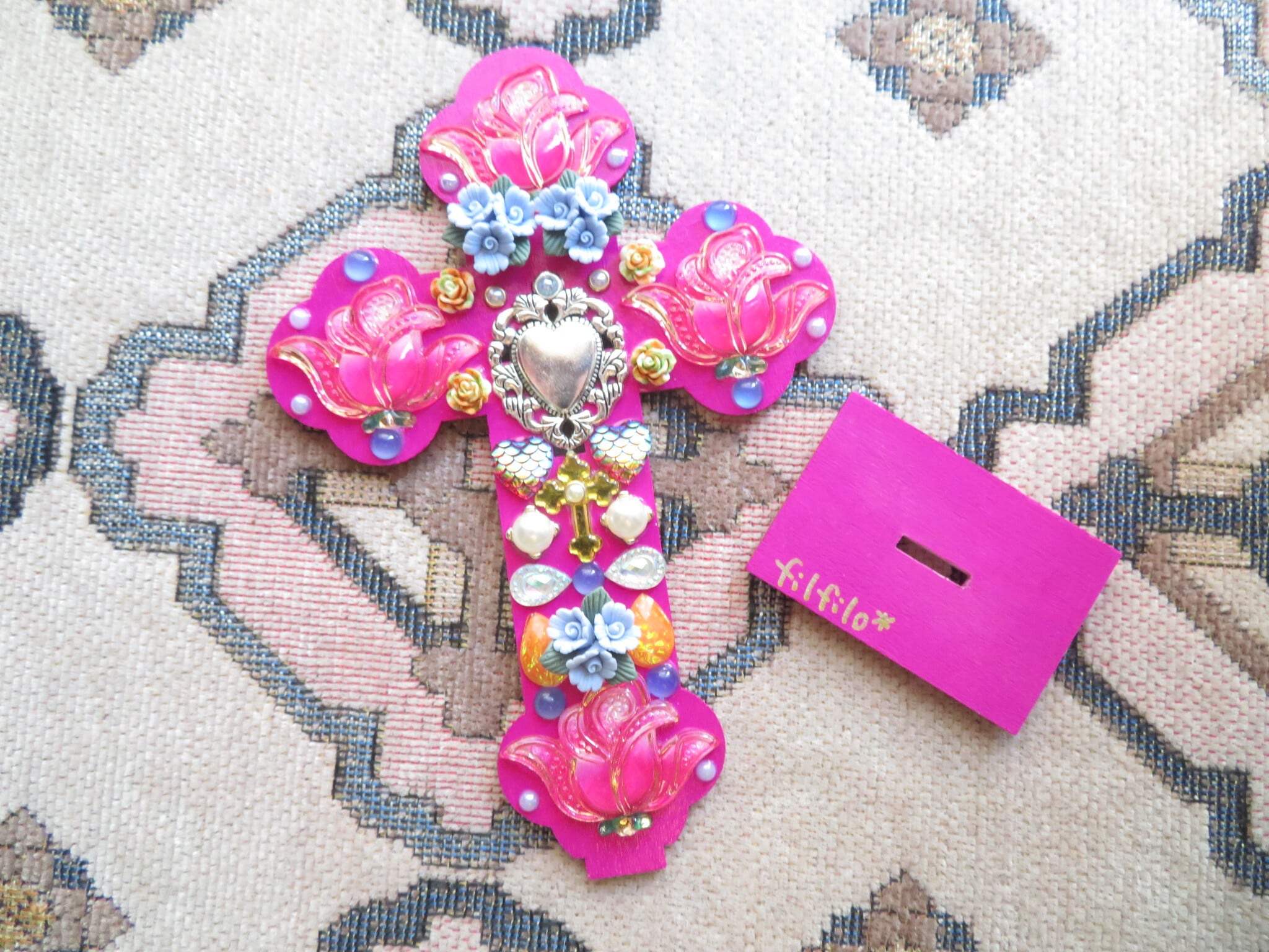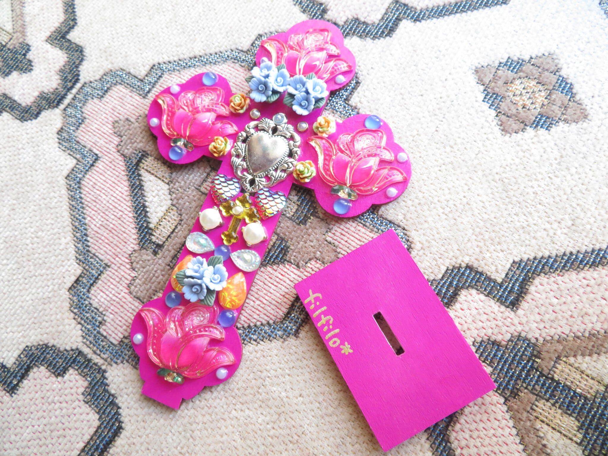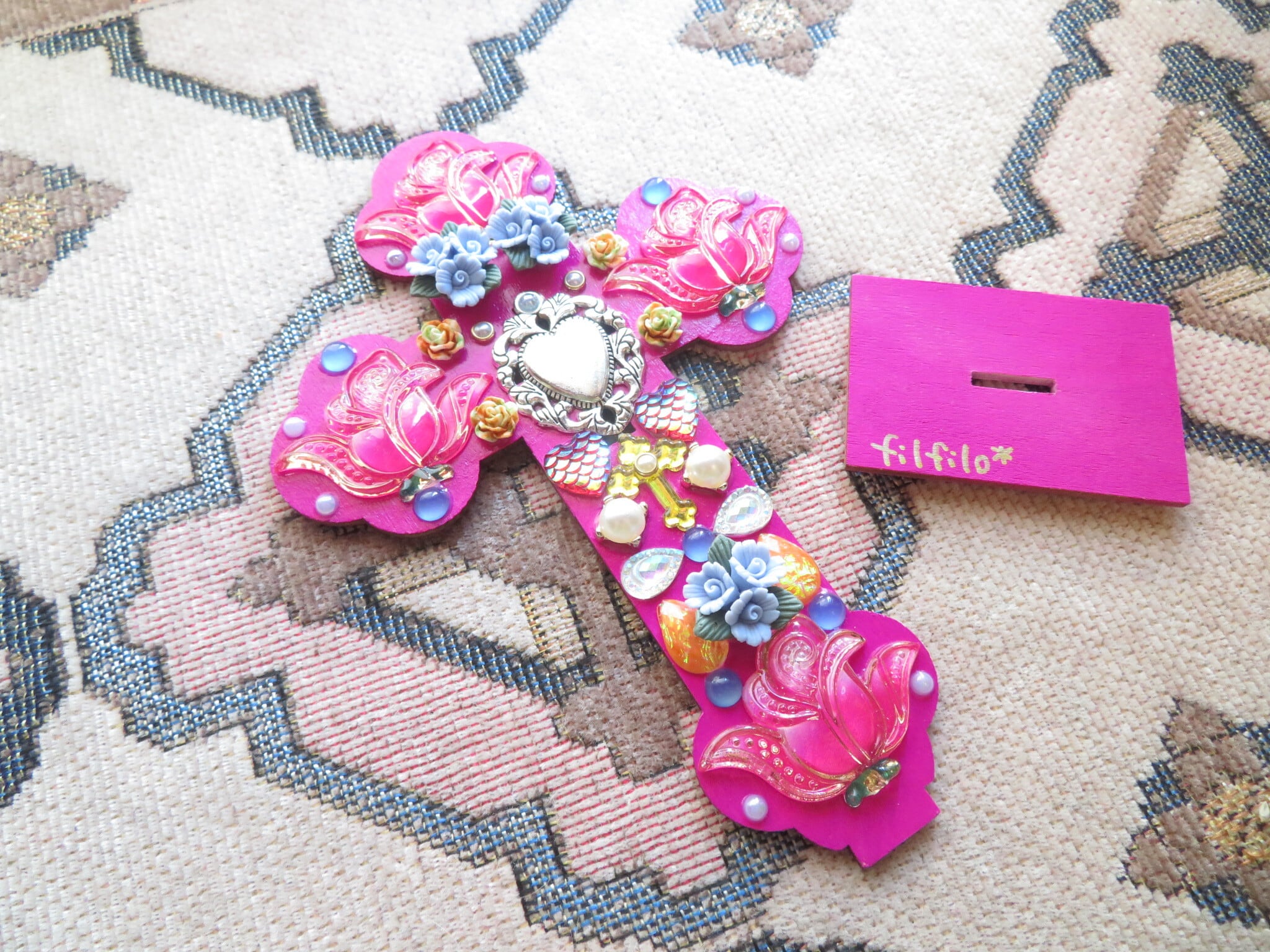 今回初登場の置き型十字架です。木製のベースを使用して塗装してデコレーションをしてニスでしあげてあります。台座に挿して平らなところに置いて飾ってください。