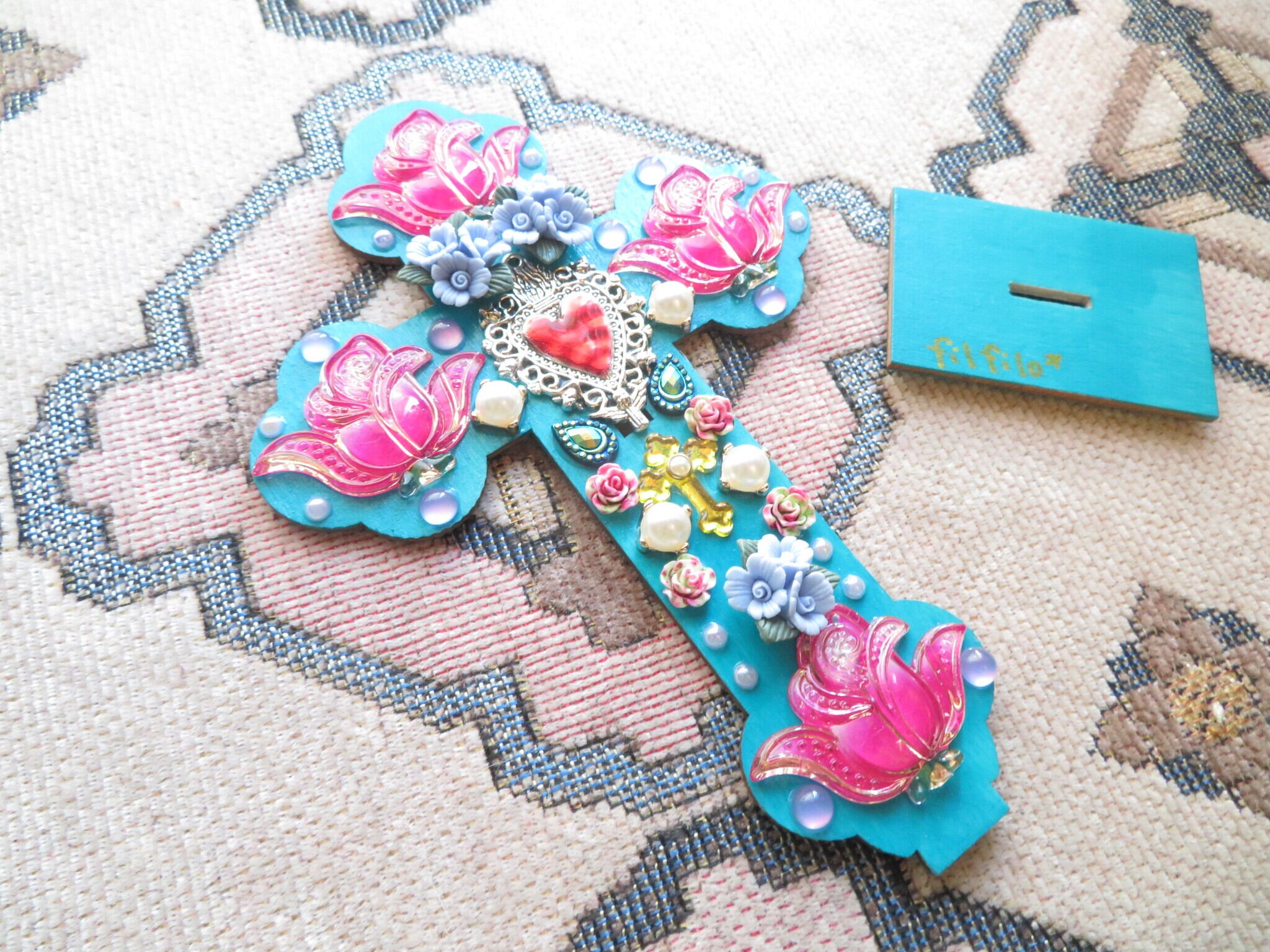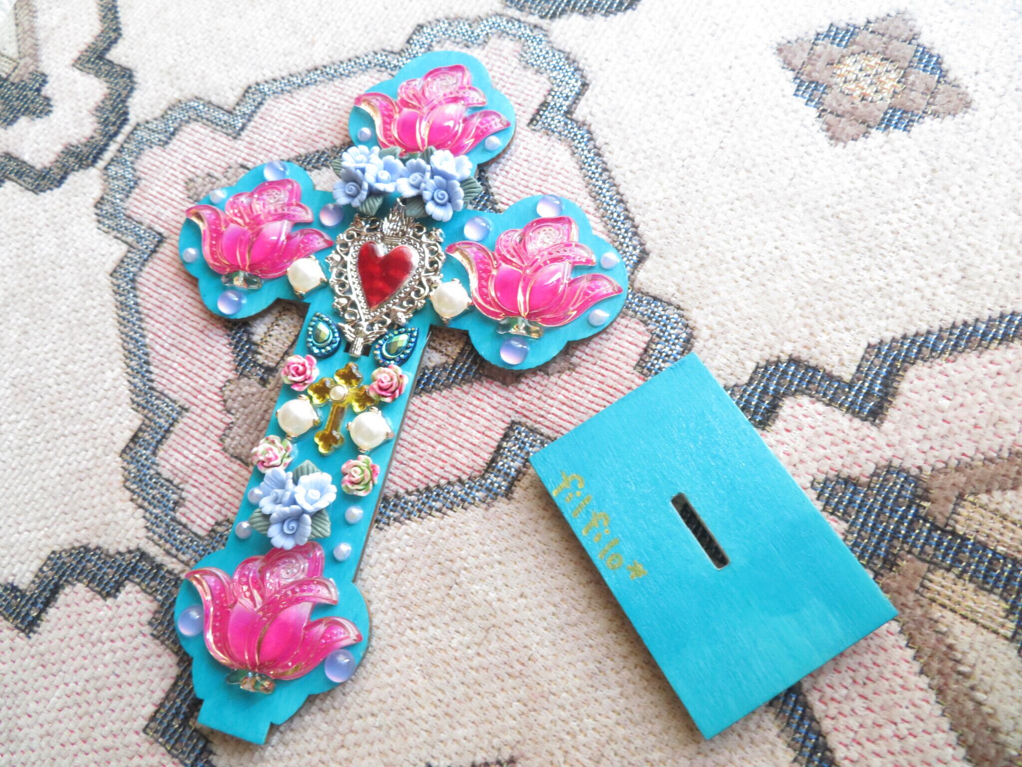 今回初登場の置き型十字架です。木製のベースを使用して塗装してデコレーションをしてニスでしあげてあります。台座に挿して平らなところに置いて飾ってください。