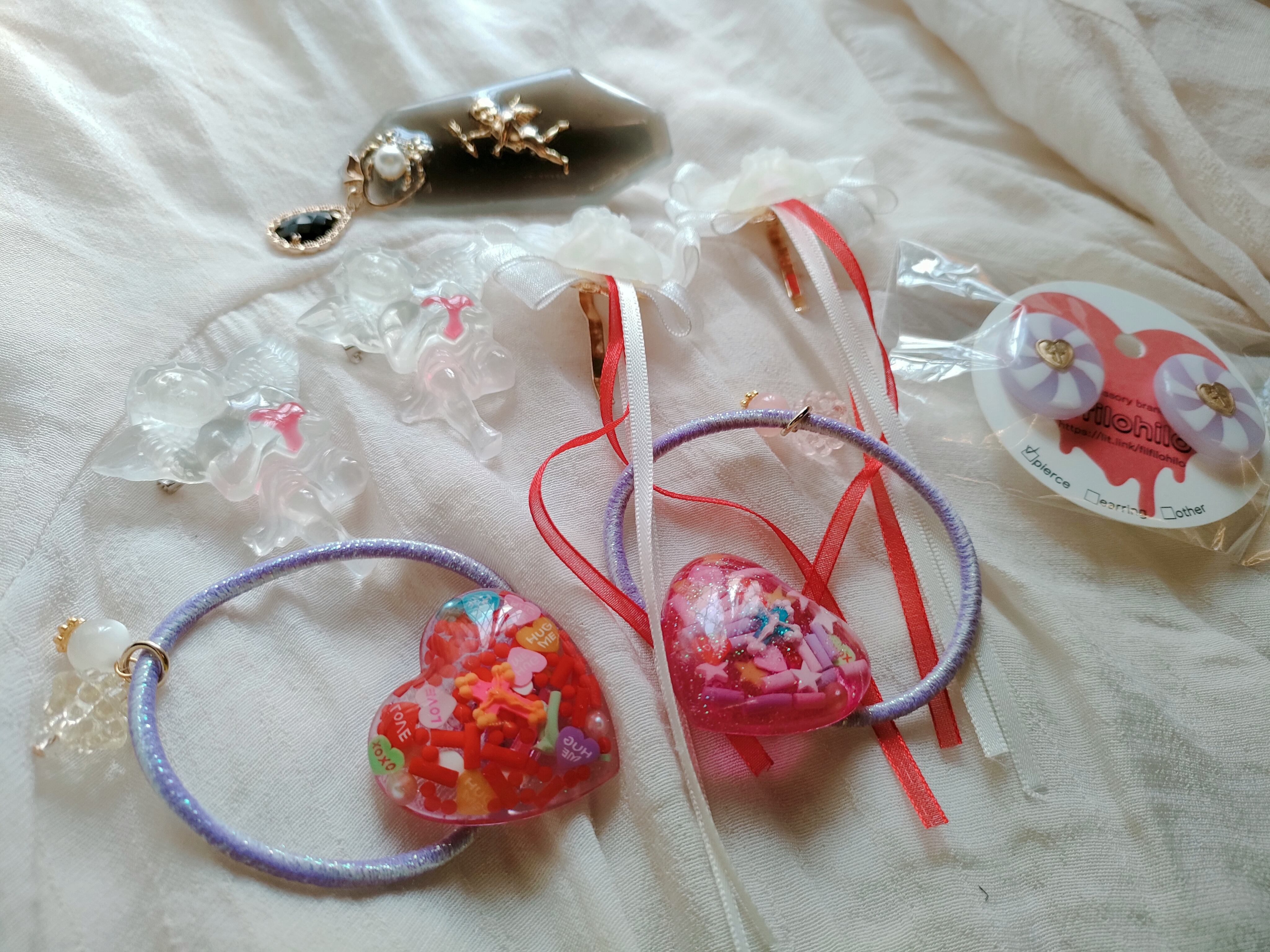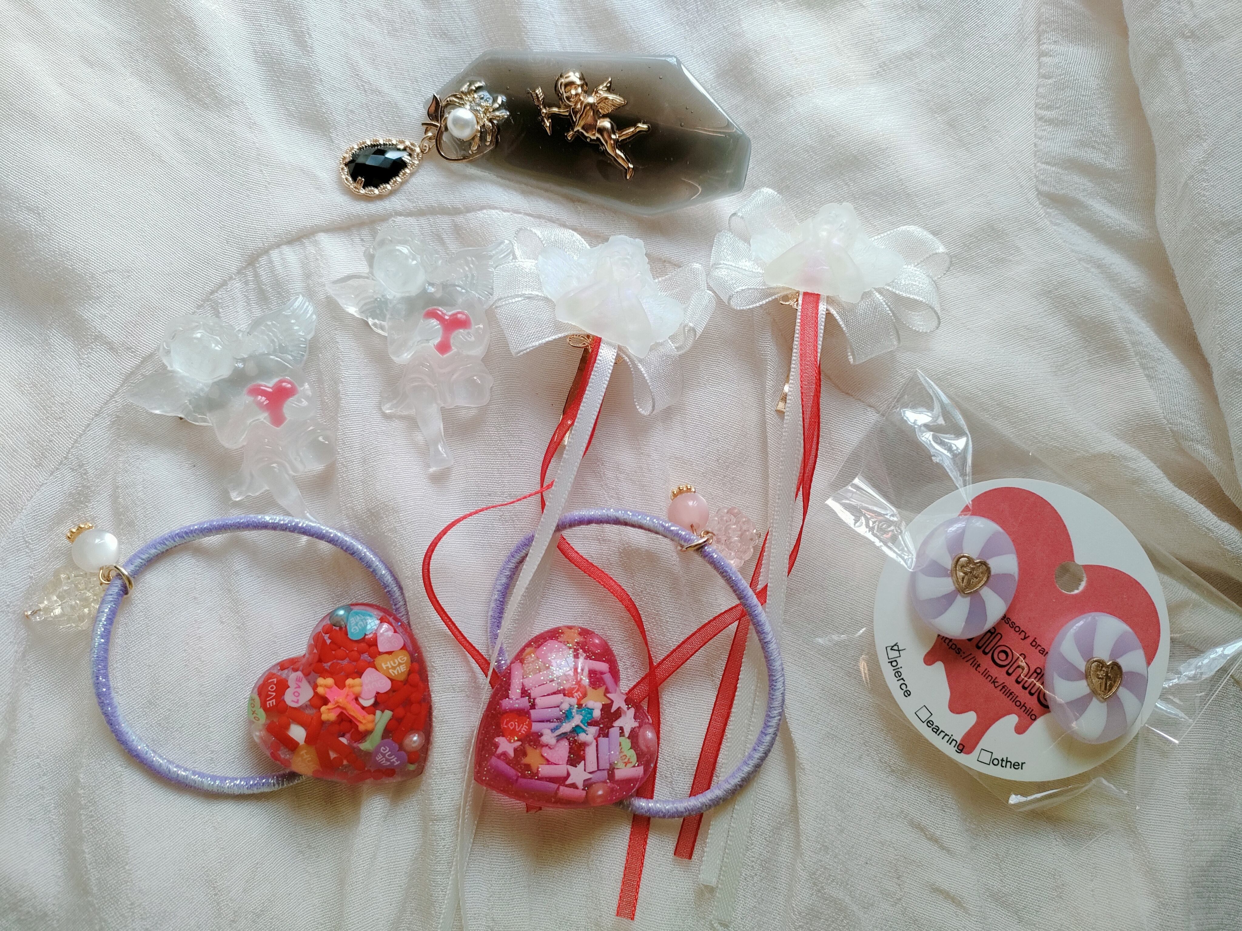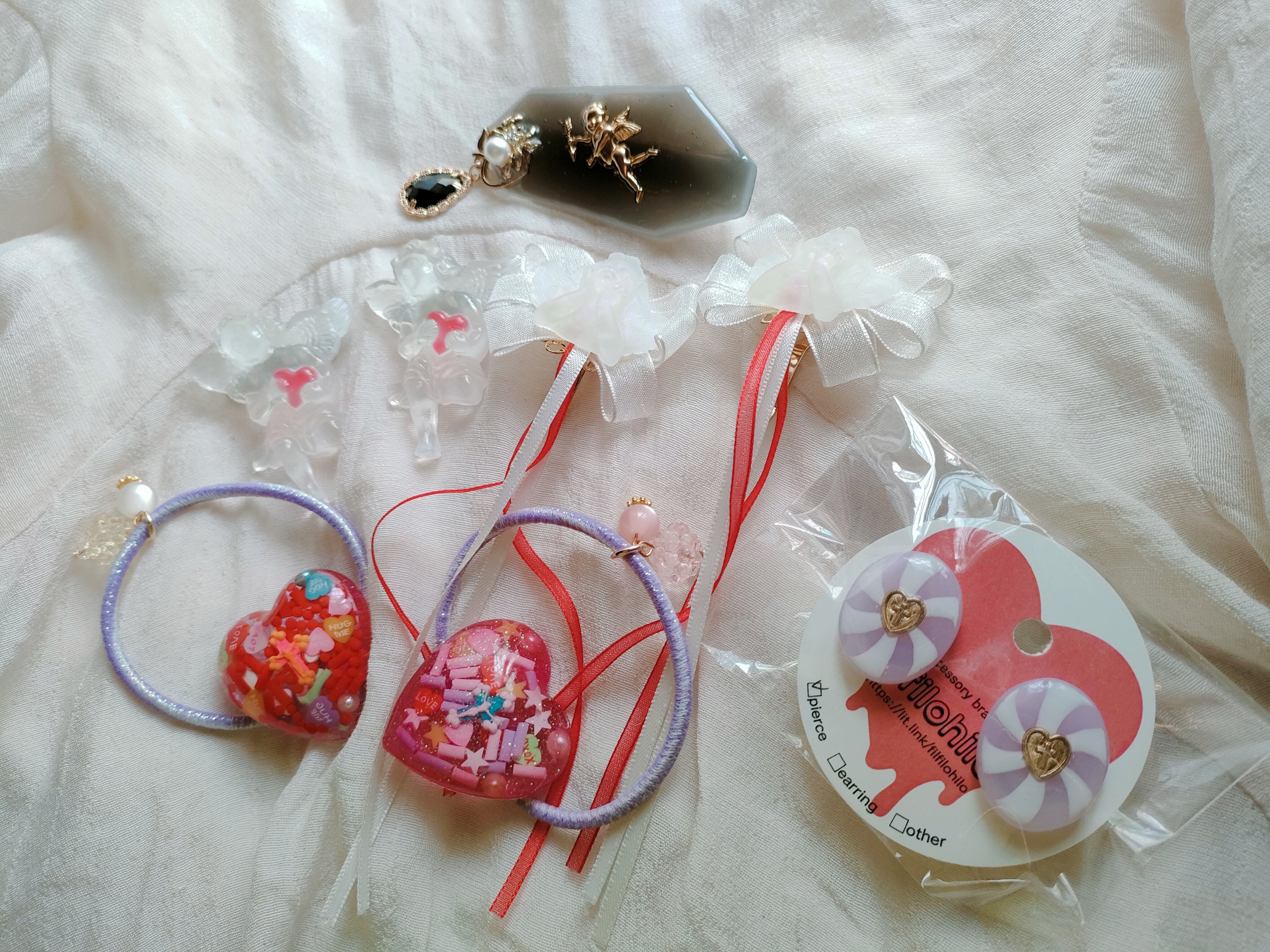 ヘアゴム2点、ポニーフック2点、ピアス、ヘアクリップ、ブローチ2点
