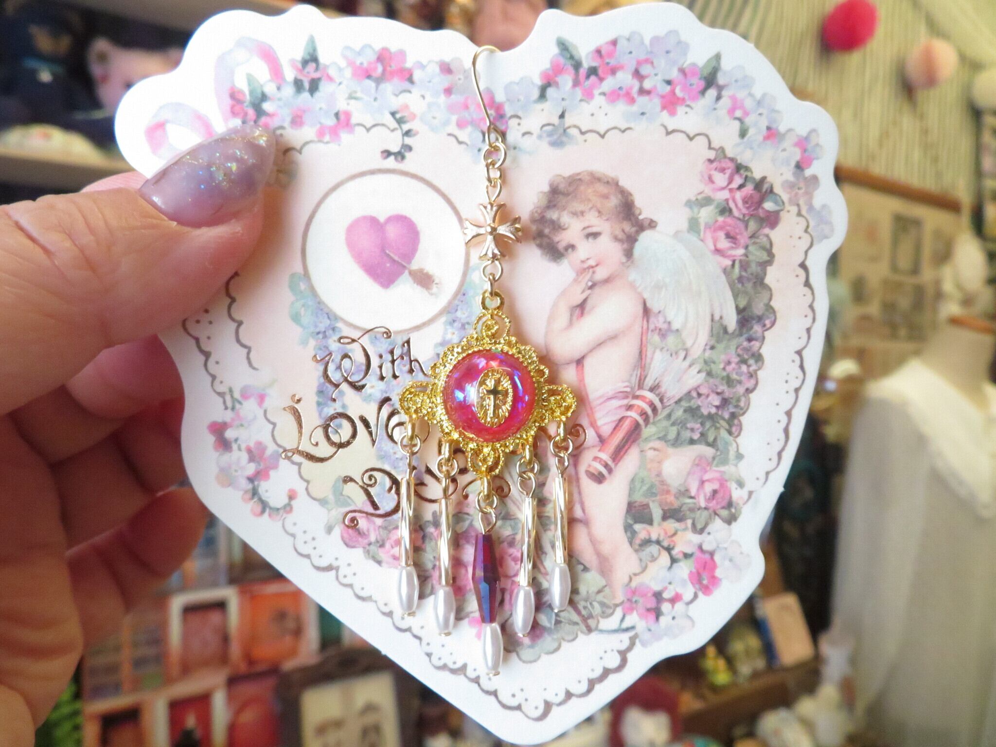 初登場です。一つ一つ手ずくりして合わせたオリジナルカボションを使ったビーズがシャランと揺れるピアスです。