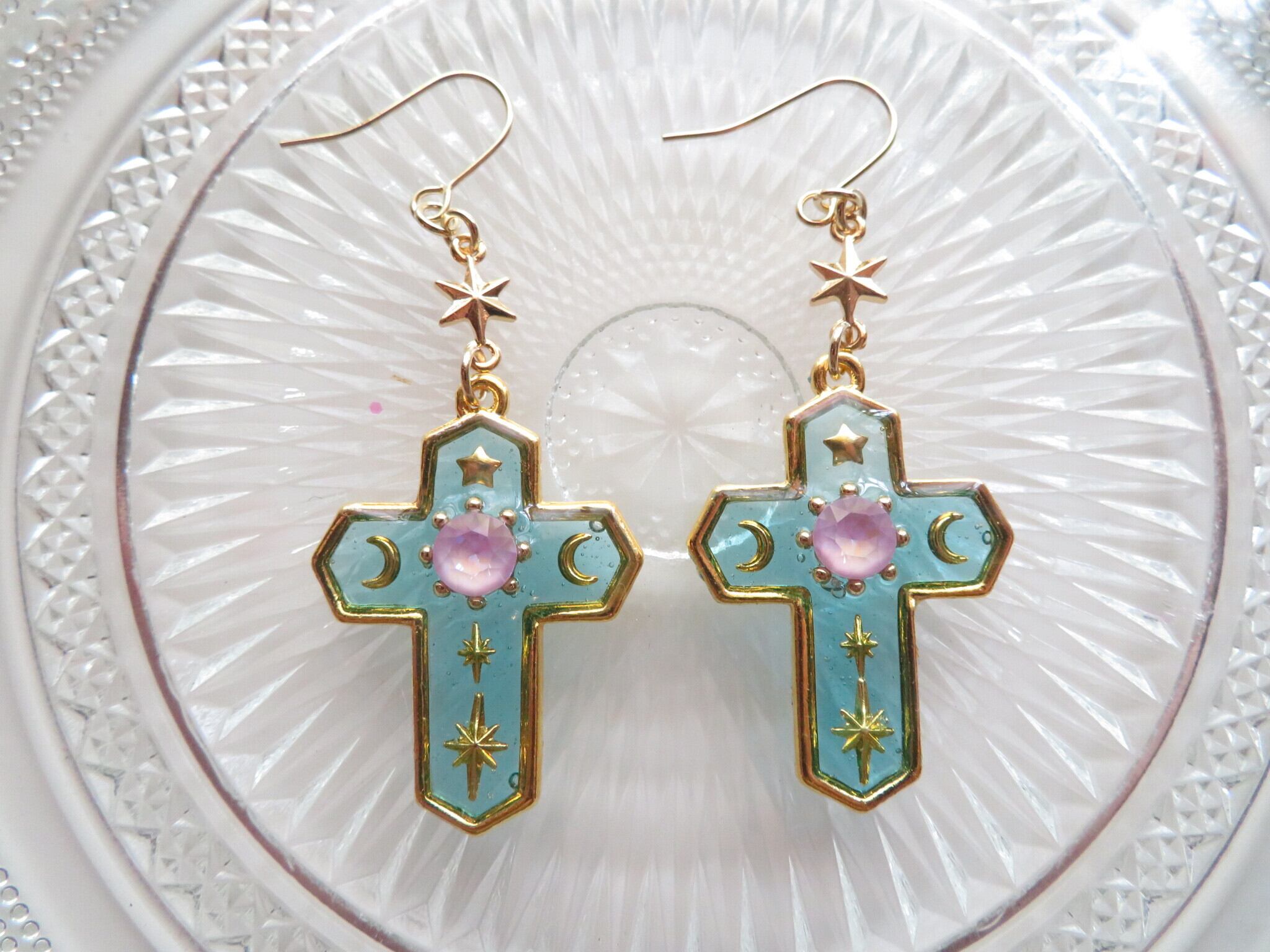 初登場です。真ん中のきらきらのクリスタルがポイントのシンプルに使えるクロスと星モチーフのピアスです。